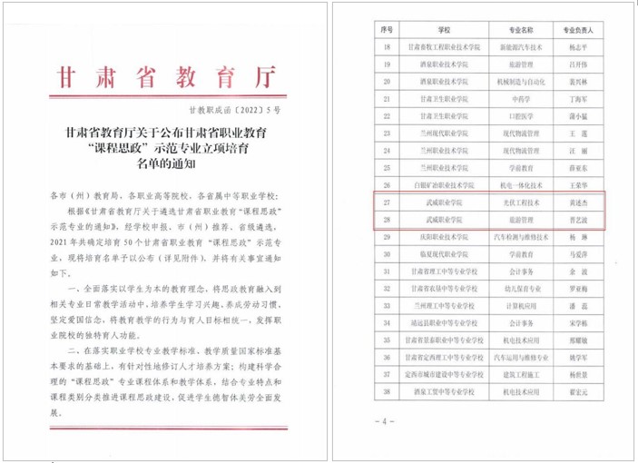 中科低碳新能源技術(shù)學(xué)院黃述杰負(fù)責(zé)的“光伏工程技術(shù)”和經(jīng)濟(jì)管理學(xué)院晉藝波負(fù)責(zé)的“旅游管理”2個(gè)專業(yè)獲評(píng)甘肅省職業(yè)教育“課程思政”示范專業(yè)。