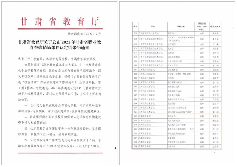 藥學(xué)院王建強(qiáng)負(fù)責(zé)的《中藥化學(xué)》、經(jīng)濟(jì)管理學(xué)院張海燕負(fù)責(zé)的《隴原民族民俗》、中科低碳新能源技術(shù)學(xué)院魏顯文負(fù)責(zé)的《光伏電站運(yùn)行與維護(hù)》、張國(guó)祥負(fù)責(zé)的《智能微電網(wǎng)應(yīng)用技術(shù)》、藝術(shù)與教育學(xué)院薛媛負(fù)責(zé)的《美術(shù)與幼兒美術(shù)創(chuàng)作——手工》、現(xiàn)代農(nóng)業(yè)學(xué)院柴貴賢負(fù)責(zé)的《土壤肥料》、工程技術(shù)學(xué)院頡棟負(fù)責(zé)的《焊接工藝與技能訓(xùn)練》、趙特慶負(fù)責(zé)的《建筑CAD》8門(mén)課程獲評(píng)甘肅職業(yè)教育在線精品課程。