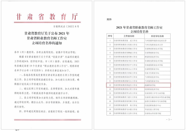 中科低碳新能源技術(shù)學(xué)院黃述杰負(fù)責(zé)的“甘肅省職業(yè)教育黃述杰工作室”獲評(píng)甘肅省職業(yè)教育名師工作室。