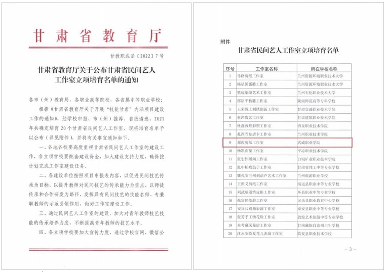 民間藝人、學(xué)校非遺技能指導(dǎo)教師鄭霞合作申報(bào)的“鄭霞剪紙工作室”,獲評(píng)甘肅省民間藝人工作室。