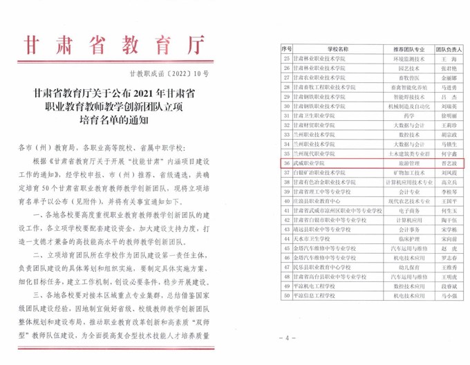 經(jīng)濟(jì)管理學(xué)院晉藝波負(fù)責(zé)的“旅游管理”專業(yè)教學(xué)團(tuán)隊(duì)獲評(píng)甘肅省職業(yè)教育教師教學(xué)創(chuàng)新團(tuán)隊(duì)。