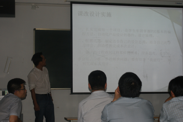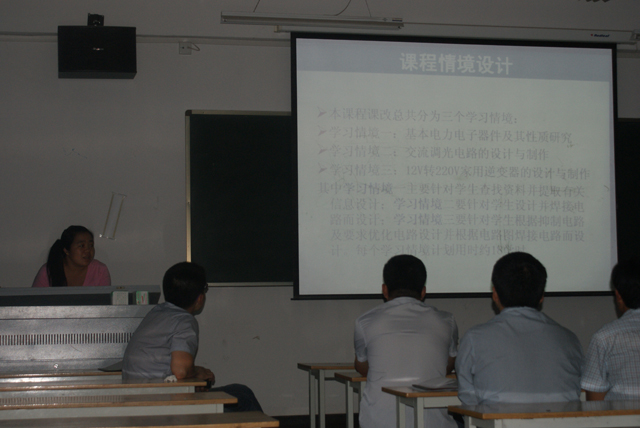 首先,上學(xué)期五位老師對課改完成情況進行交流匯報。顏魯薪、何立國、張國祥、袁亞琳和張娟老師分別就上學(xué)期所帶課程《光伏材料制備與加工》、《光伏產(chǎn)品的生產(chǎn)與質(zhì)檢》、《電氣與PLC控制系統(tǒng)的運行與維護》、《風(fēng)能與利用技術(shù)》及《電力電子技術(shù)》等五門課程從課程規(guī)劃、課程實施、成果展示、教學(xué)評價四個方面進行了詳細的匯報。