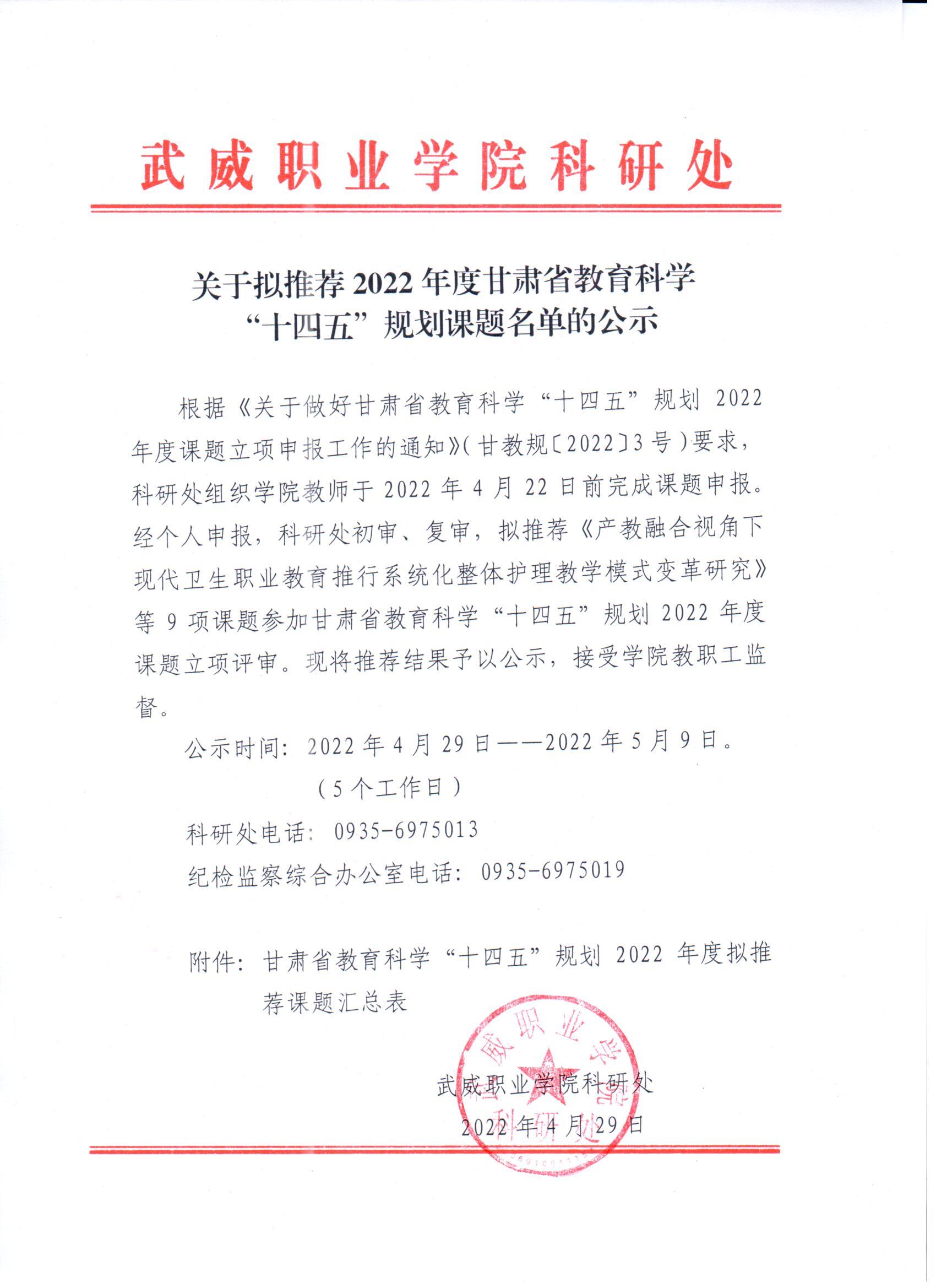 關(guān)于擬推薦2022年度甘肅省教育科學(xué)“十四五”規(guī)劃課題名單的公示
