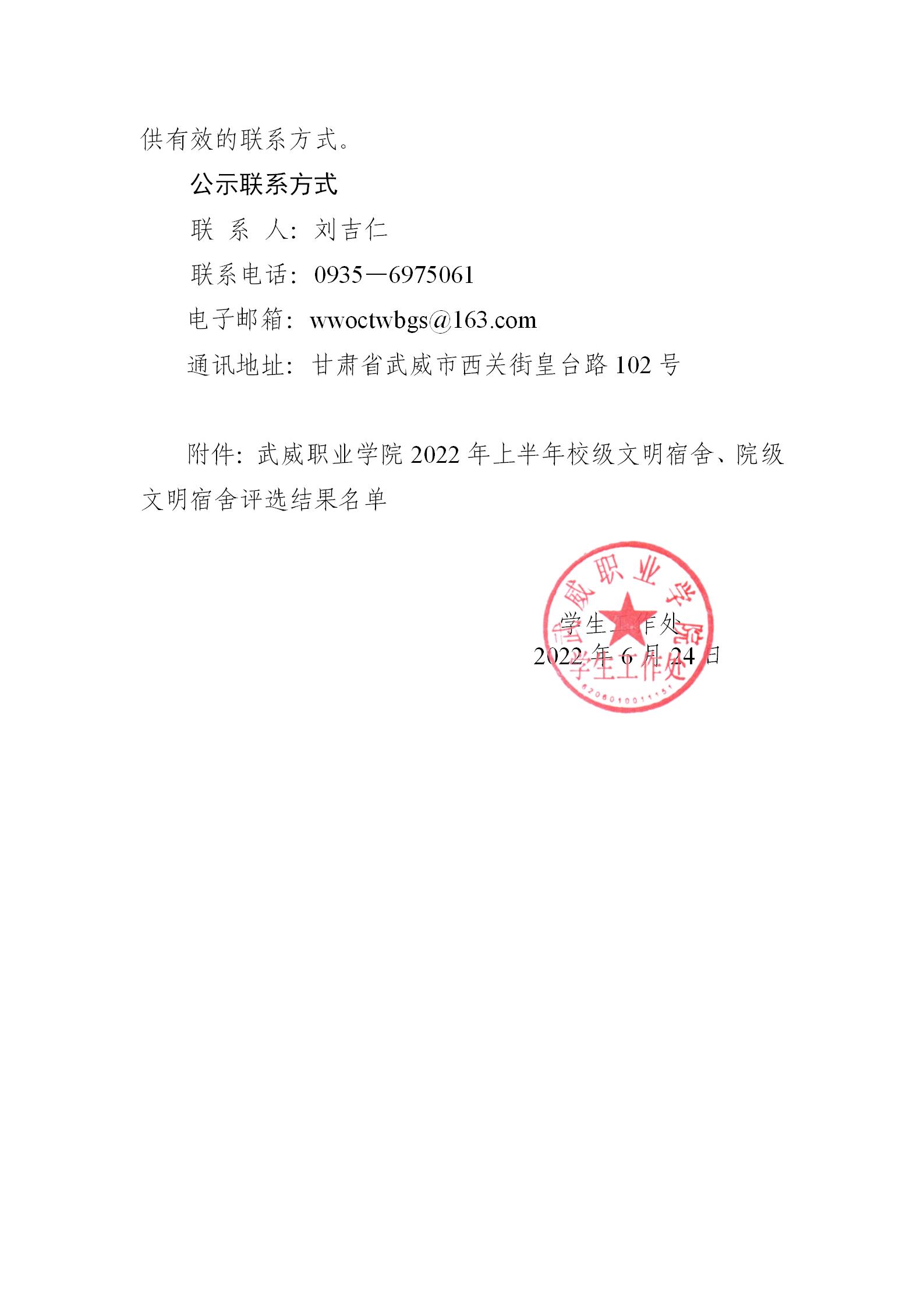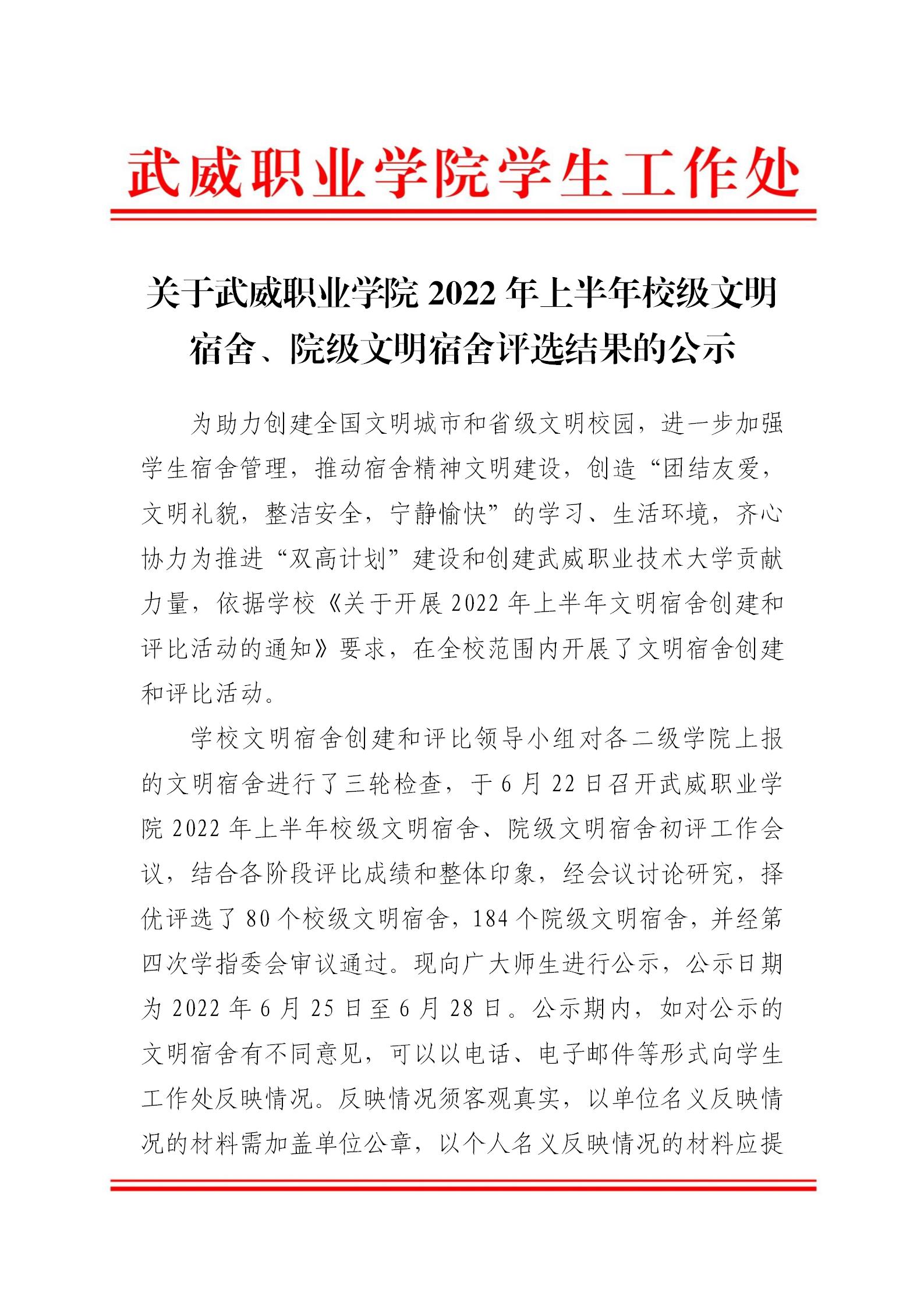 關(guān)于武威職業(yè)學(xué)院2022年上半年校級(jí)文明宿舍、院級(jí)文明宿舍評(píng)選結(jié)果的公示