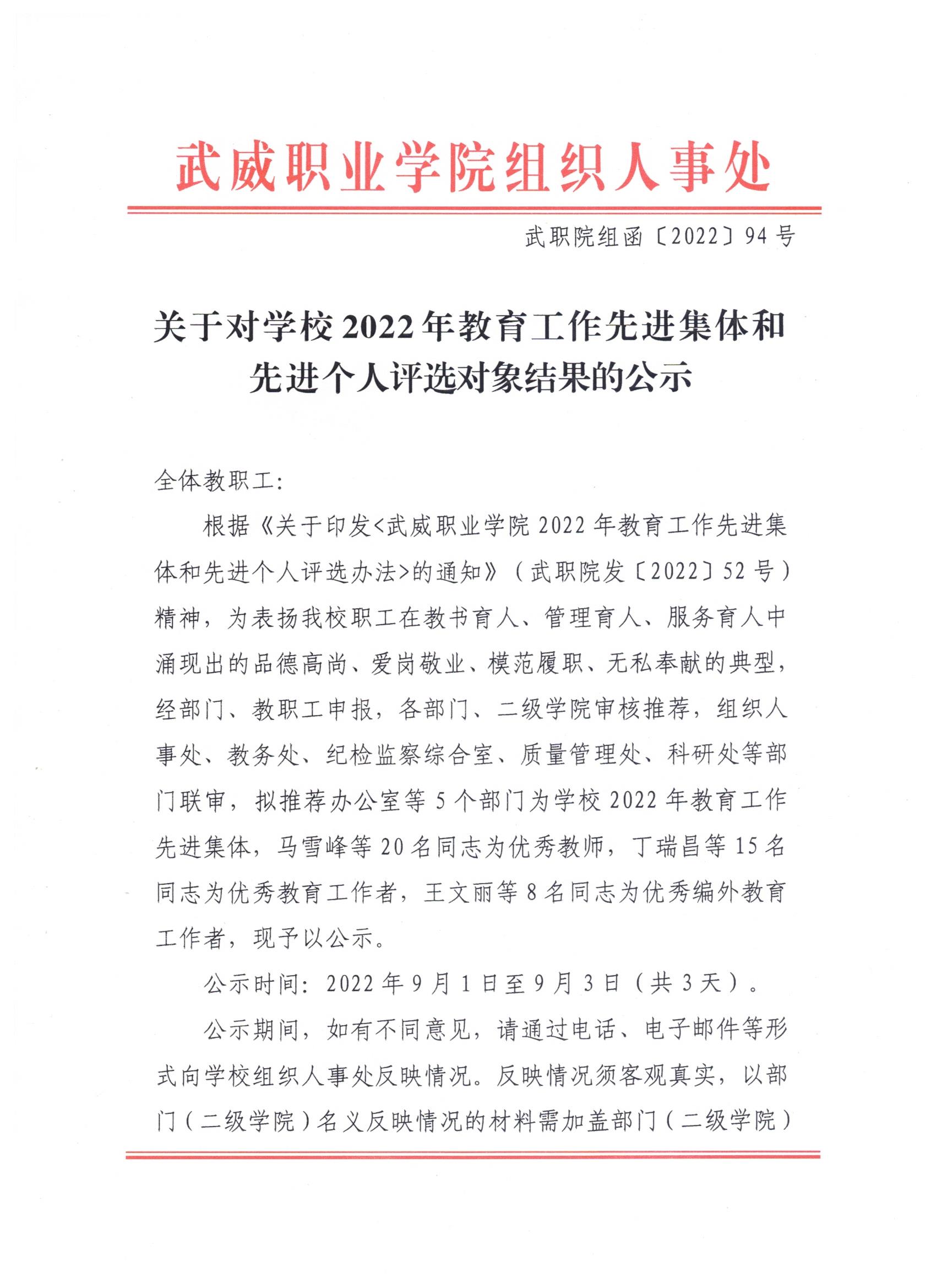 關(guān)于對學校2022年教育工作先進集體和先進個人評選對象結(jié)果的公示