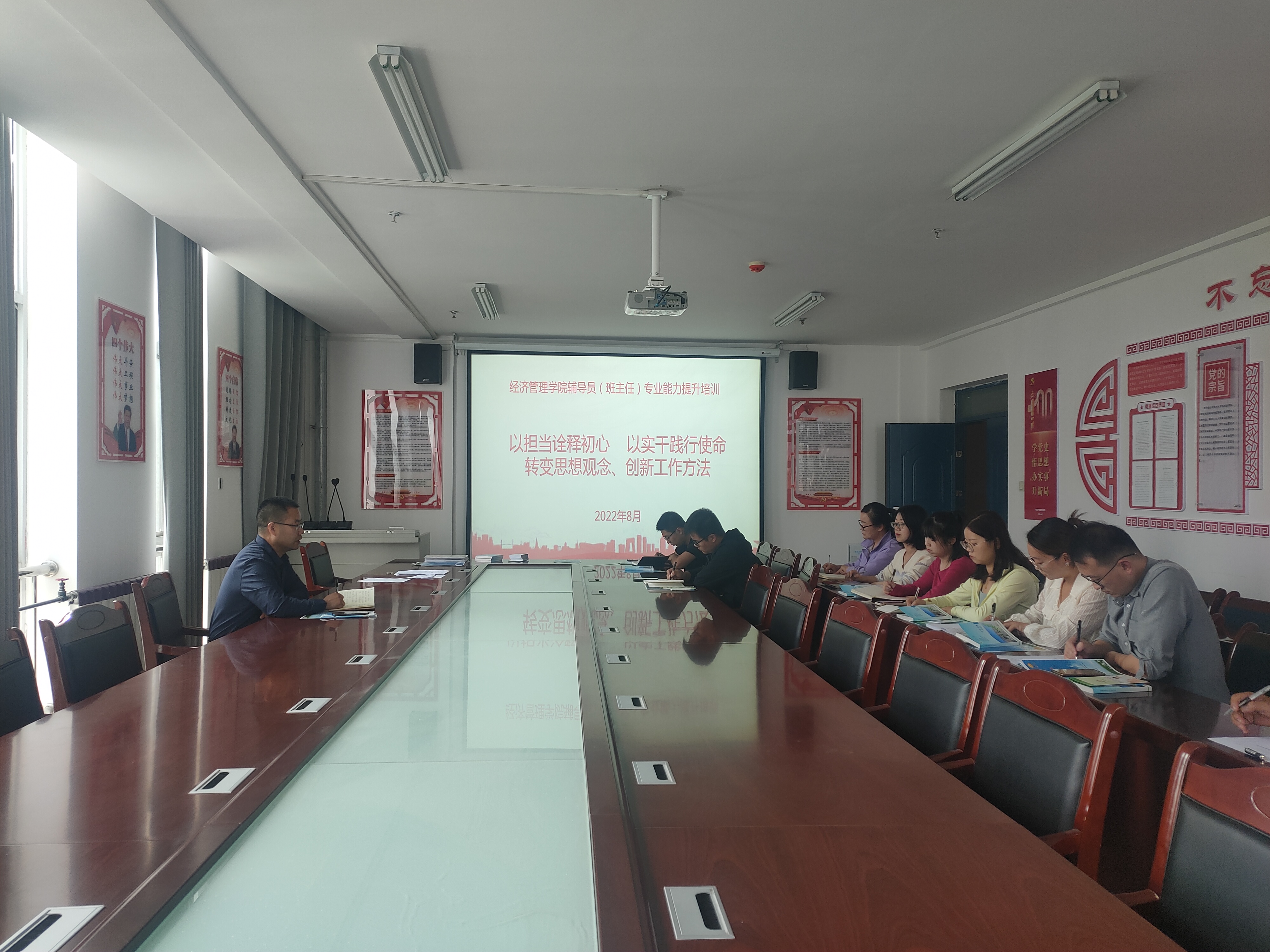 為提高學(xué)生管理水平,提升班主任隊(duì)伍整體素質(zhì),經(jīng)濟(jì)管理學(xué)院于8月30日在經(jīng)緯樓306會(huì)議室召開了“以擔(dān)當(dāng)詮釋初心 以實(shí)干踐行使命---——轉(zhuǎn)變思想觀念、創(chuàng)新工作方法”為主題的班主任專業(yè)能力提升培訓(xùn)會(huì)。會(huì)議由經(jīng)濟(jì)管理學(xué)院黨總支書記張伯成主持,全體班主任、輔導(dǎo)員參加了本次會(huì)議。