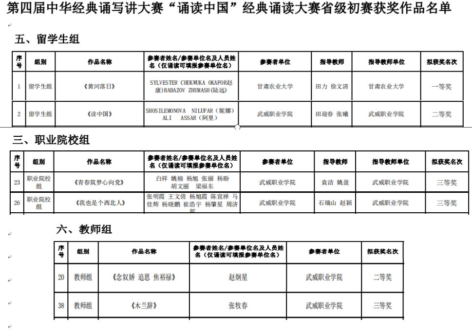 今日,甘肅省教育廳下發(fā)《甘肅省語言文字工作委員會 甘肅省教育廳關于公布第四屆中華經(jīng)典誦寫講大賽“誦讀中國”經(jīng)典誦讀大賽及“筆墨中國”漢字書寫大賽省級初賽獲獎作品名單的通知》,學校選送的留學生組作品《讀中國》榮獲二等獎,并由省教育廳推送參加國賽誦讀大賽;