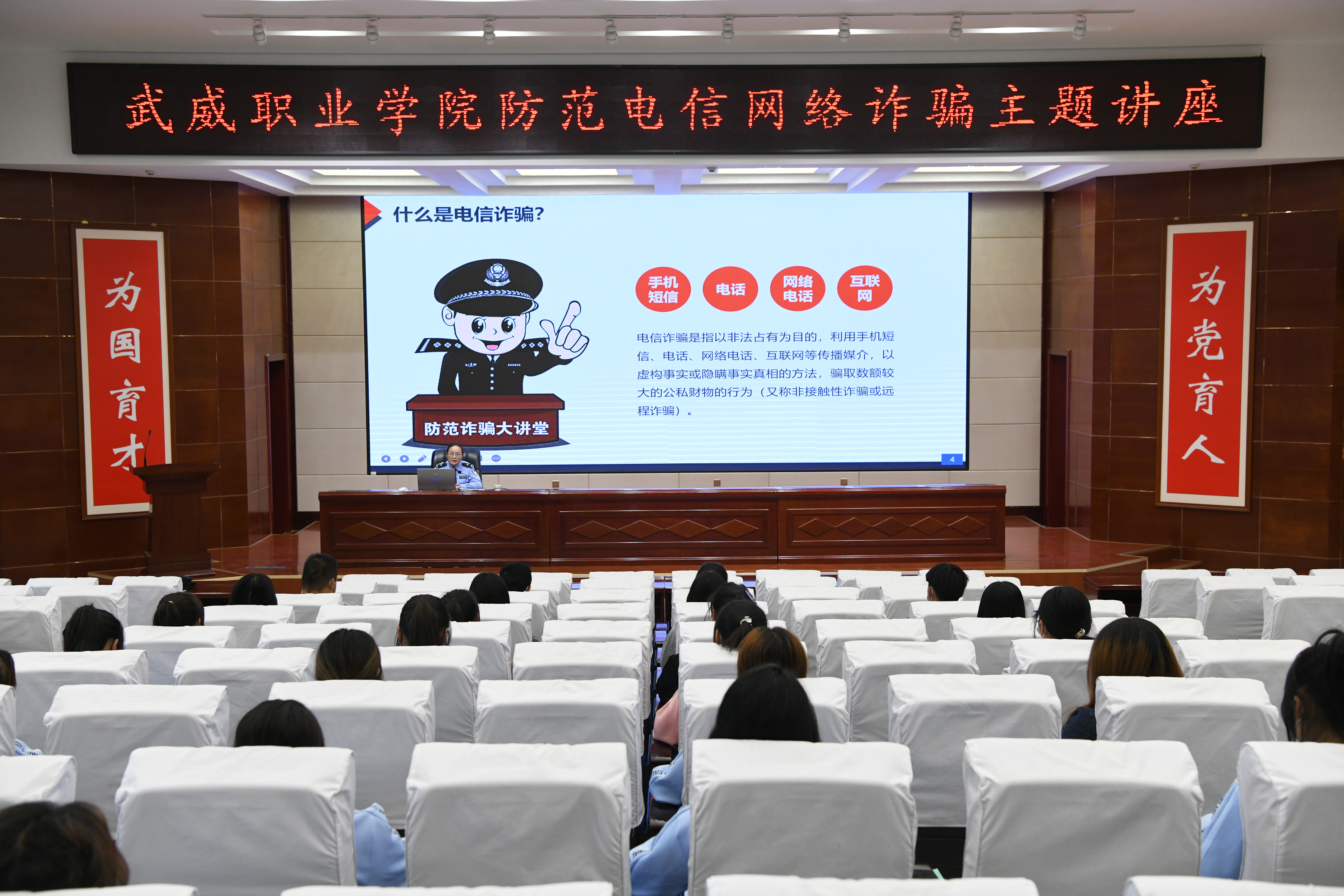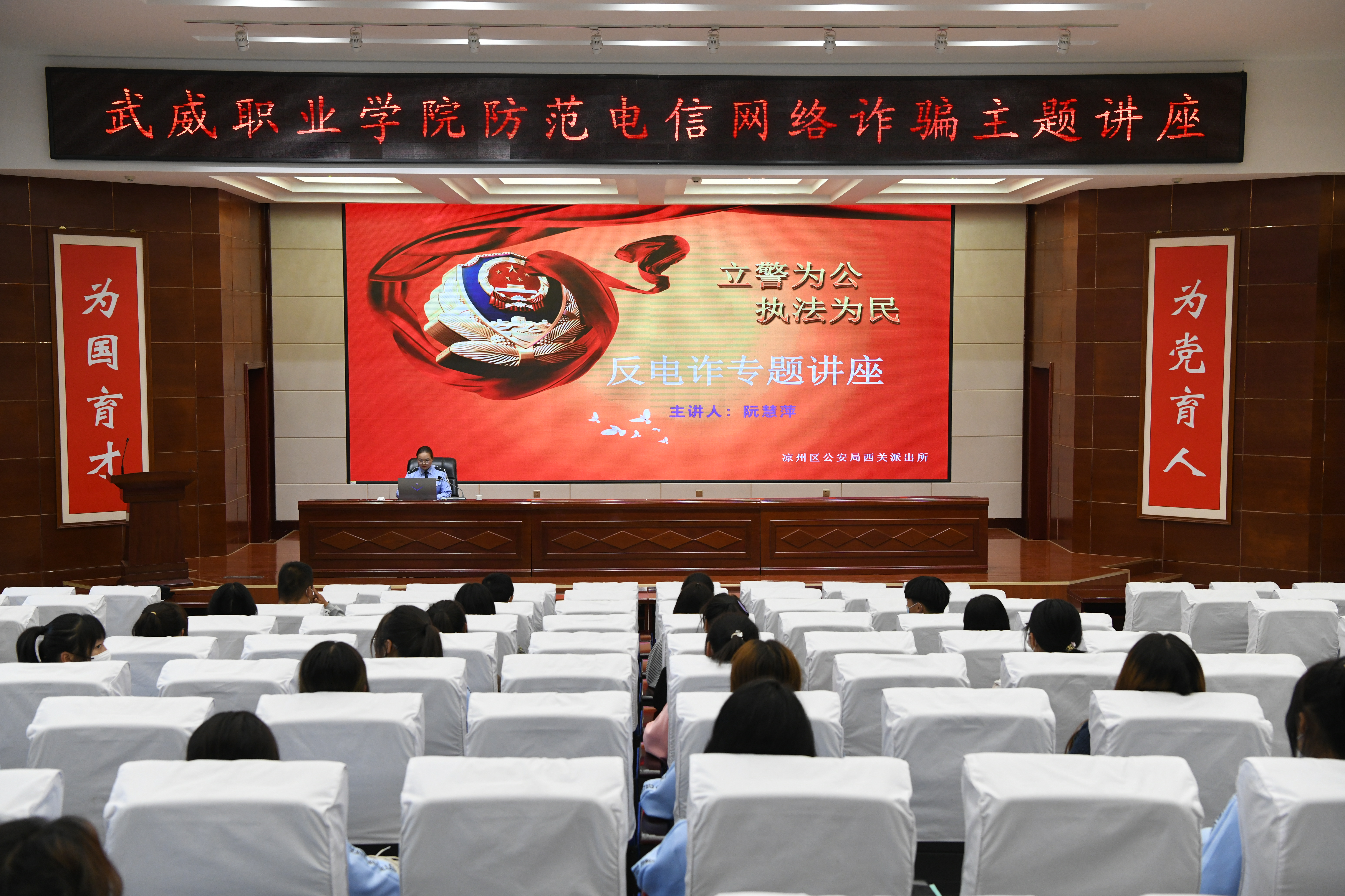 為了提高學(xué)校師生識別和防范電信網(wǎng)絡(luò)詐騙的能力,切實(shí)做好防范電信網(wǎng)絡(luò)詐騙宣傳教育工作。9月30日,學(xué)校聯(lián)合武威市公安局涼州分局西關(guān)派出所在學(xué)生發(fā)展中心菁英廳舉辦防范電信網(wǎng)絡(luò)詐騙專題講座。各二級學(xué)院師生代表聆聽了講座,講座由安全保衛(wèi)處負(fù)責(zé)人李欣主持。