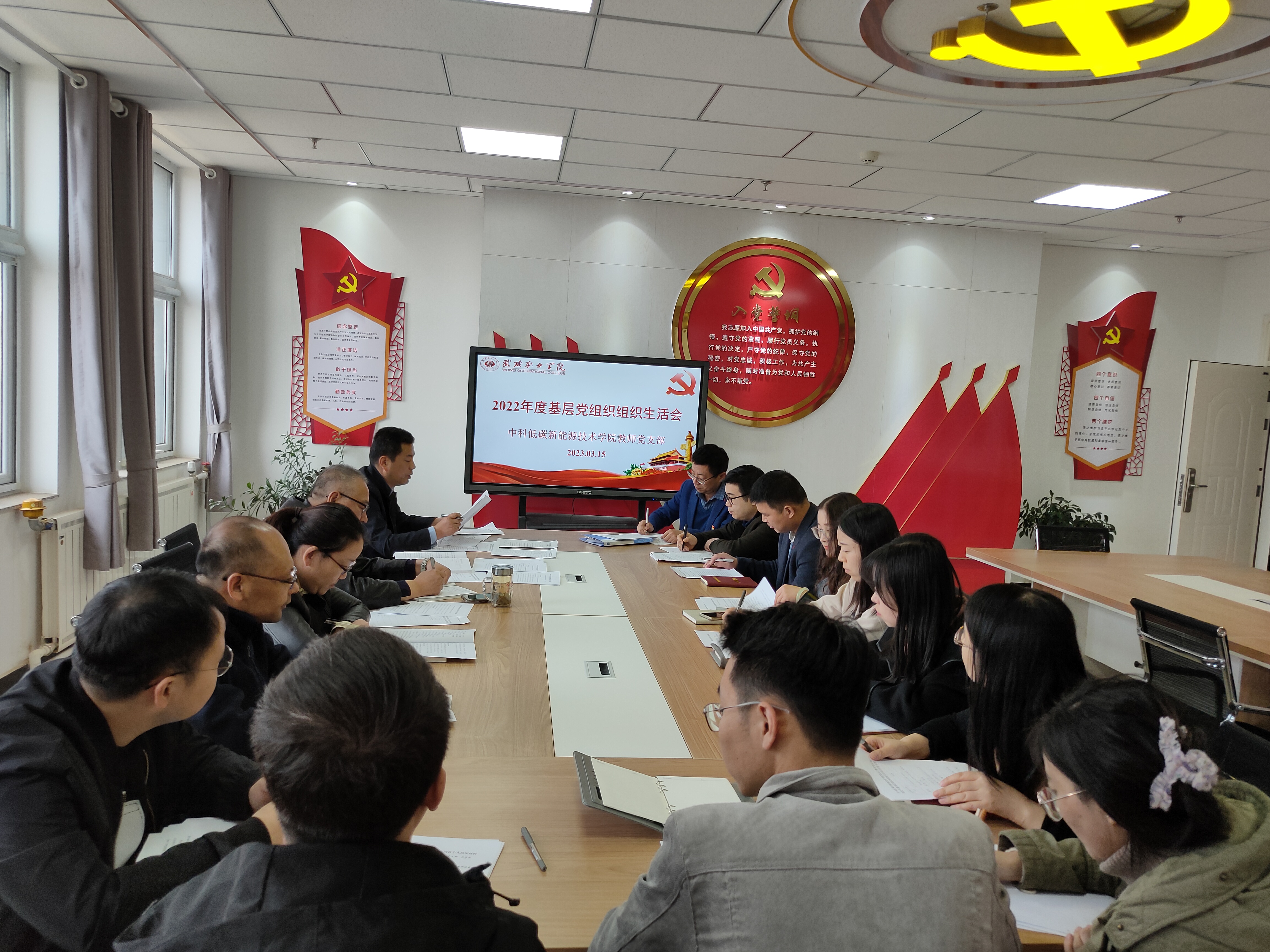 為深入學(xué)習(xí)貫徹黨的二十大精神,堅持不懈用習(xí)近平新時代中國特色社會主義思想凝心鑄魂,不斷提升基層黨組織政治功能和組織力,進一步激發(fā)黨員充分發(fā)揮先鋒模范作用,按照校黨委統(tǒng)一部署,3月15日下午,中科低碳新能源技術(shù)學(xué)院教師黨支部、學(xué)生黨支部在能源科技樓610、604召開2022年度基層黨組織組織生活會和開展民主評議黨員活動。會議由兩個支部書記主持,支部全體黨員參加,學(xué)校第二督導(dǎo)組成員張世亮、許中璞全程參與督導(dǎo)。