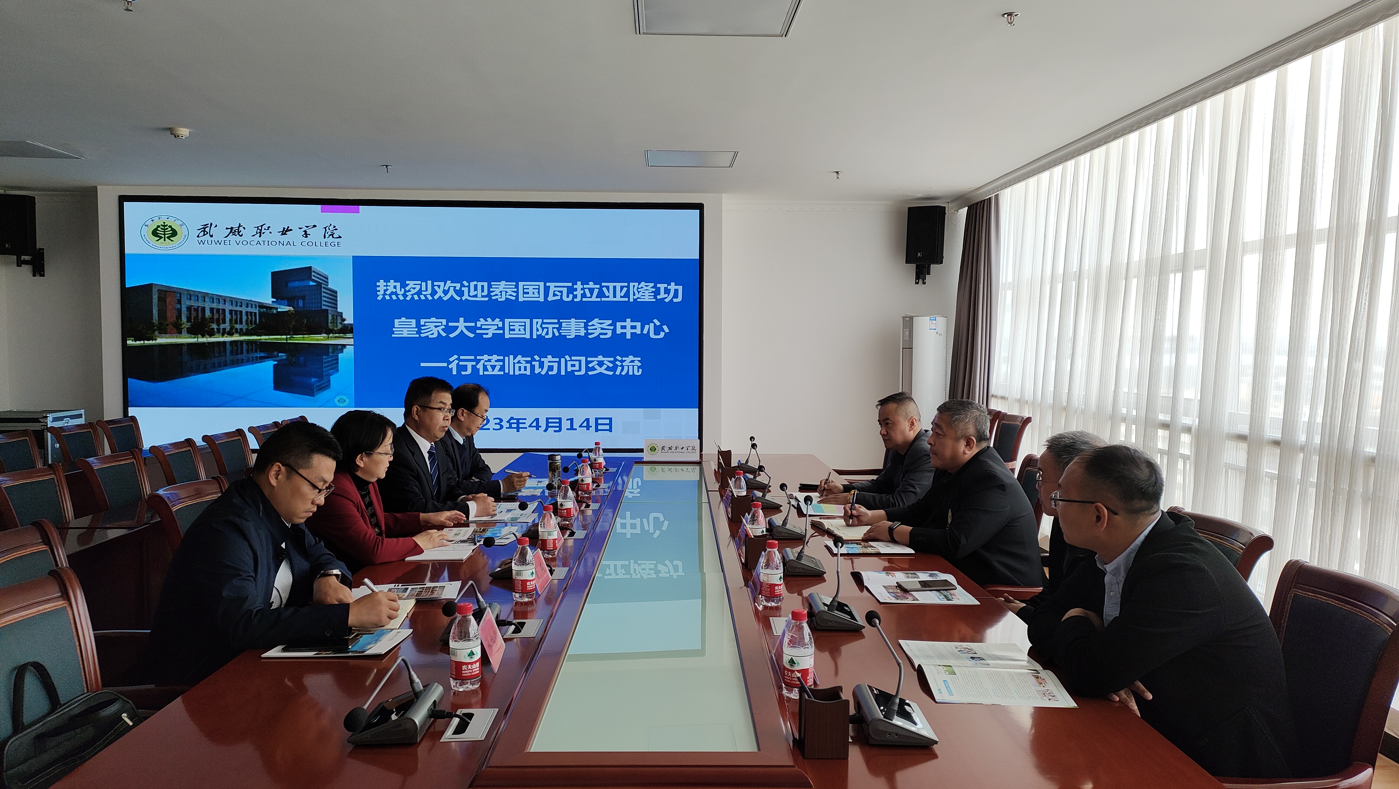 4月14日下午,泰國(guó)瓦拉亞隆功皇家大學(xué)國(guó)際事務(wù)中心主任一行4人對(duì)學(xué)校進(jìn)行了友好訪問(wèn)。瓦拉亞隆功皇家大學(xué)國(guó)際事務(wù)中心主任王天松教授,瓦拉亞隆功皇家大學(xué)中國(guó)區(qū)主任宋建達(dá),瓦拉亞隆功皇家大學(xué)甘肅片區(qū)主任閆學(xué)良以及副主任付幸林到訪學(xué)校。學(xué)校黨委委員、副校長(zhǎng)田迎春出席交流座談會(huì),國(guó)際合作交流處、招生就業(yè)處、經(jīng)濟(jì)管理學(xué)院、護(hù)理學(xué)院、醫(yī)學(xué)技術(shù)學(xué)院負(fù)責(zé)人以及相關(guān)人員參加座談交流。