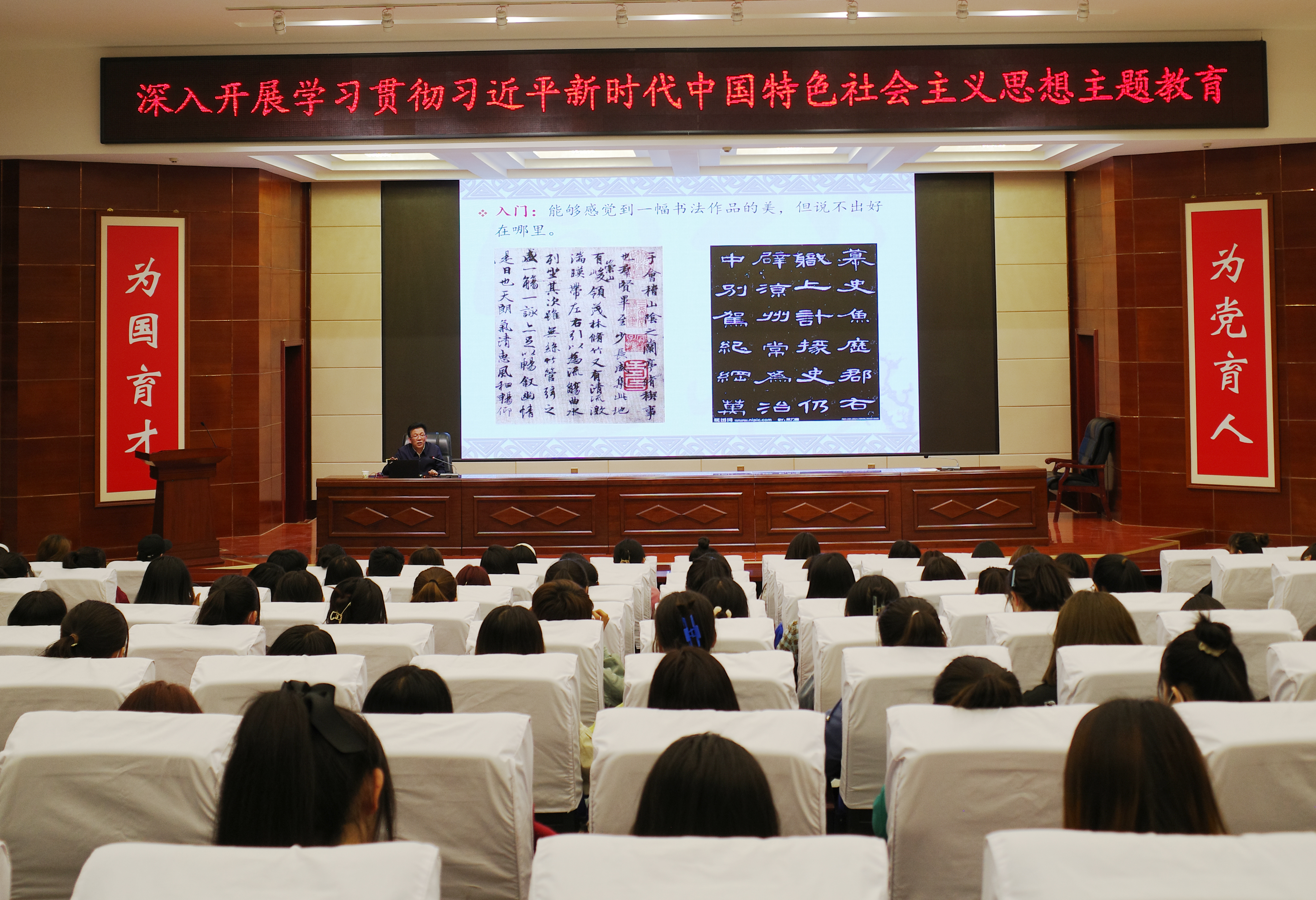 活動(dòng)中,齊澤山在菁英廳為師生做了題為“如何欣賞書法作品”專題講座,他介紹了中國書法藝術(shù)的起源、傳統(tǒng)、特點(diǎn),以《蘭亭序》《曹全碑》等多幅經(jīng)典書法作品為例,深入解析了書法藝術(shù)的魅力與內(nèi)涵,清晰呈現(xiàn)了中國書法悠久的歷史脈絡(luò),使師生們對中國書法藝術(shù)的起源與發(fā)展有了更加深刻地理解。講座引經(jīng)據(jù)典、風(fēng)趣幽默、親切自然,讓師生在輕松愉悅的氛圍中升華了對書法藝術(shù)的審美感受。師生們紛紛表示,此次講座是一次難得的學(xué)習(xí)機(jī)會(huì),受益匪淺,對中國書法藝術(shù)有了更深入、更全面的了解。