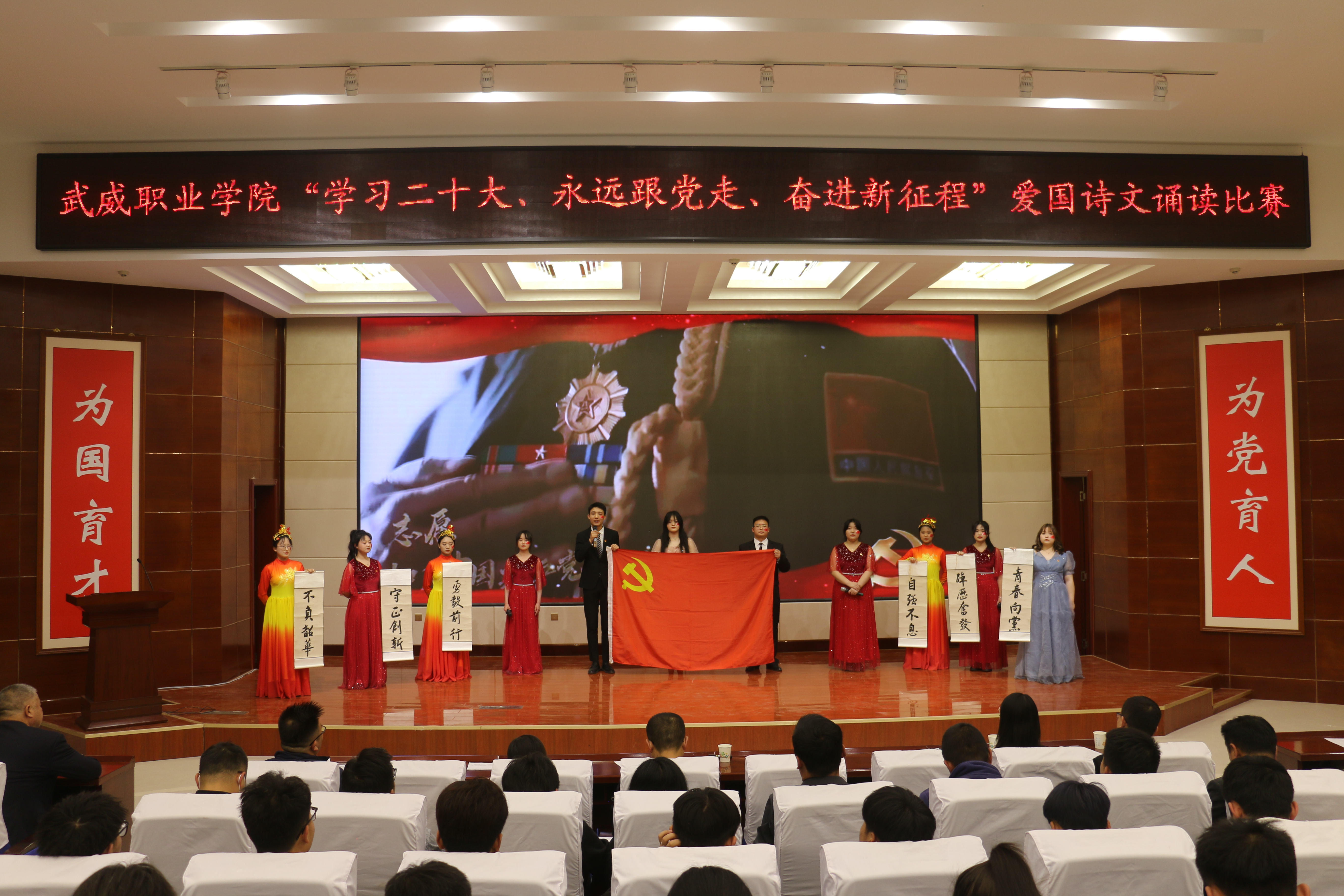大賽于3月啟動,歷時一個月,各二級學(xué)院經(jīng)過初賽評比推選出9個優(yōu)秀節(jié)目入圍決賽。比賽現(xiàn)場,各參賽隊以“學(xué)習(xí)二十大、永遠(yuǎn)跟黨走、奮進(jìn)新征程”為主題,將傳承經(jīng)典詩文和弘揚愛國主義精神結(jié)合,誦詩抒情、借詞言志,熱情謳歌中國共產(chǎn)黨不懈奮斗的光輝歷程,全面展現(xiàn)新時代青年以夢為馬,不負(fù)韶華的青春風(fēng)貌。校團(tuán)委原創(chuàng)編排表演的節(jié)目《追夢八步沙,奮斗正青春》,深情動人,感染全場,歌頌了“六老漢”矢志艱苦奮斗的隴人品格,抒發(fā)了當(dāng)代青年永跟黨走,青春建功的豪情壯志。富余藝術(shù)感染力的經(jīng)典吟誦,穿插舞蹈、劇情和紅歌演唱,為廣大師生呈現(xiàn)了一場視聽盛宴。