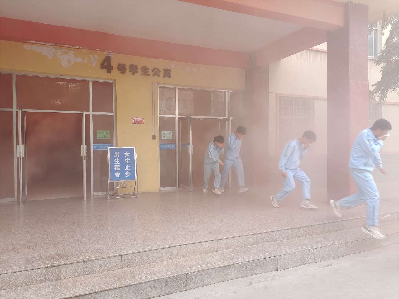 14時(shí)40分,疏散演練正式開始。隨著火災(zāi)警報(bào)響起,各學(xué)生公寓樓冒出滾滾濃煙,公寓管理人員迅速組織學(xué)生有序疏散。在軍訓(xùn)教官、學(xué)生管理人員的引導(dǎo)下,同學(xué)們按照動(dòng)作要領(lǐng),用濕毛巾捂住口鼻,俯身彎腰按照安全出口指示牌指引快速、有序從疏散通道撤離到體育場(chǎng),整個(gè)過程緊張有序、實(shí)用性強(qiáng),收到了預(yù)期效果。