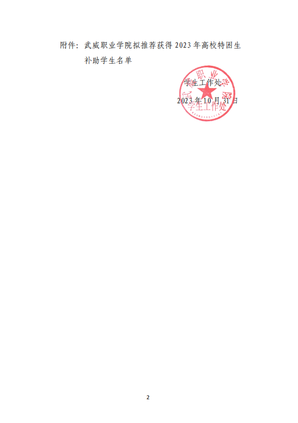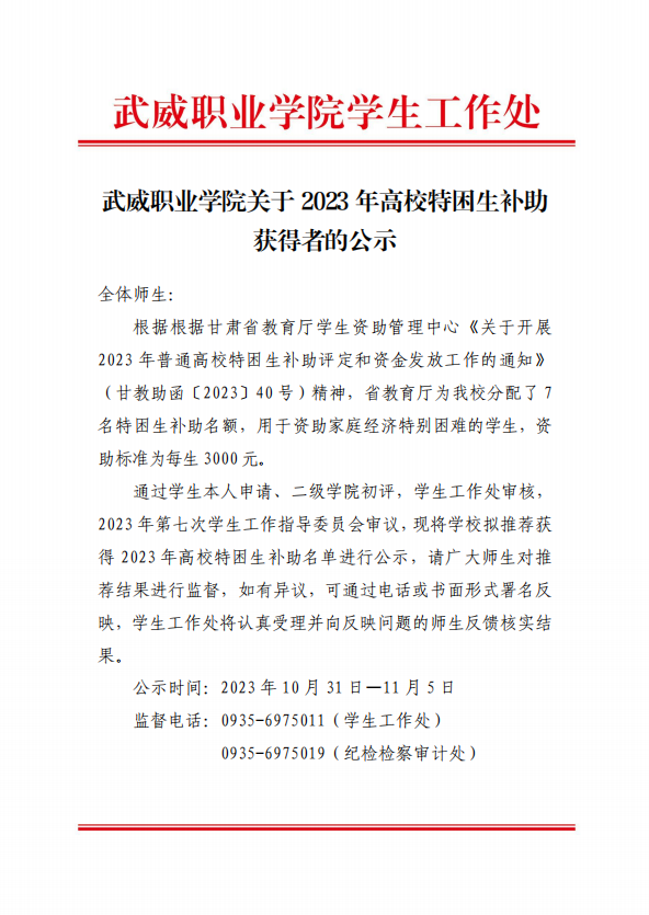 武威職業(yè)學(xué)院關(guān)于2023年高校特困生補助獲得者的公示