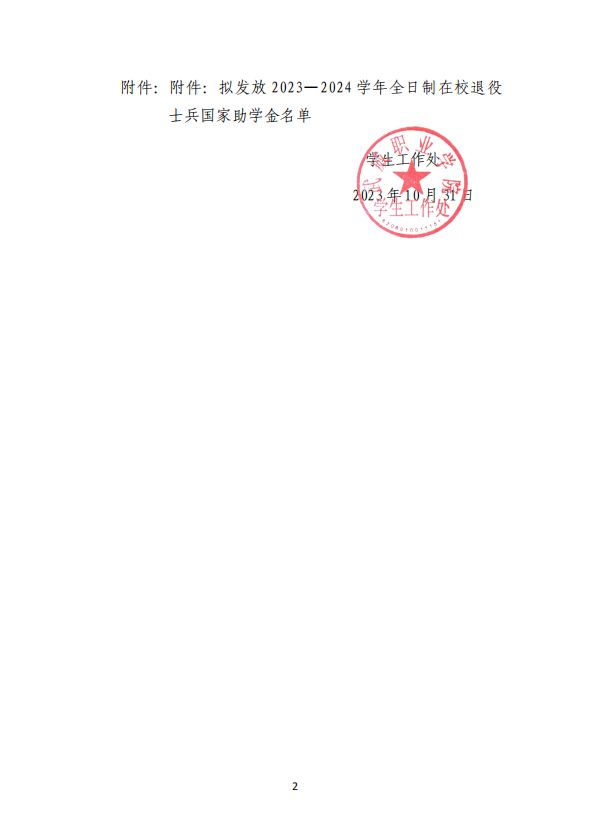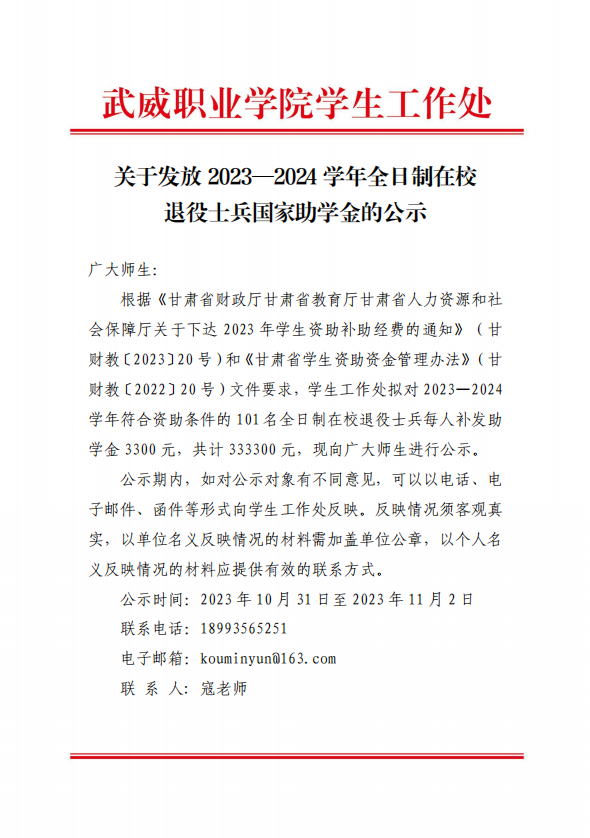 關(guān)于擬發(fā)放2023—2024學(xué)年全日制在校退役士兵國家助學(xué)金的公示