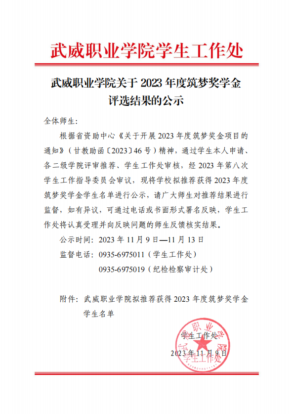 武威職業(yè)學(xué)院關(guān)于2023年度筑夢獎(jiǎng)學(xué)金評選結(jié)果的公示