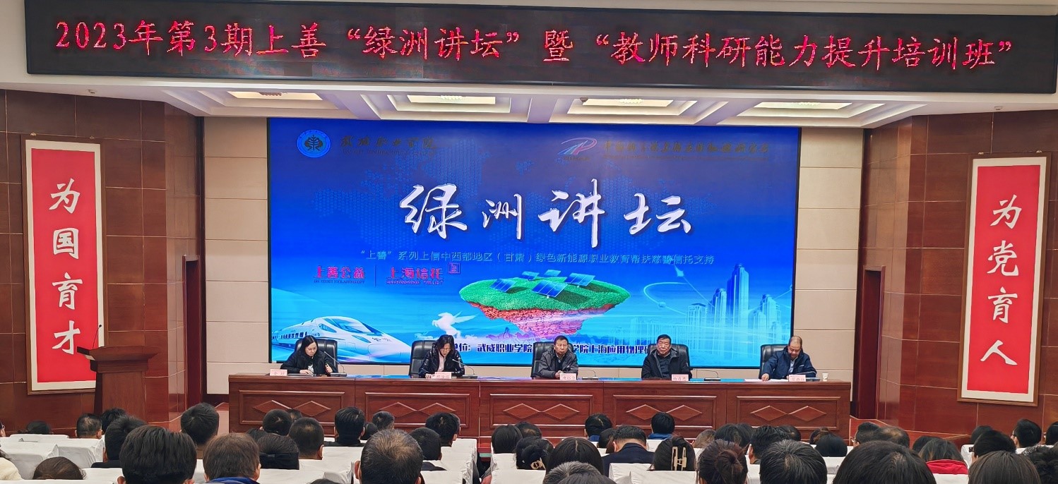 為進(jìn)一步深入學(xué)習(xí)貫徹黨的二十大精神,落實(shí)中共中央辦公廳、國務(wù)院辦公廳印發(fā)的《關(guān)于深化現(xiàn)代職業(yè)教育體系建設(shè)改革的意見》精神,切實(shí)開展“科教融匯、產(chǎn)教融合”,2023年11月10日,武威職業(yè)學(xué)院2023年第3期上善“綠洲講壇”學(xué)術(shù)報告會暨“教師科研能力提升培訓(xùn)班”在學(xué)校菁英廳開講。原中科院上海應(yīng)用物理研究所黨委書記唐裕華;上海應(yīng)物所高級教育顧問,中科低碳新能源技術(shù)學(xué)院院長楊存忠教授;“上善”慈善信托公司總經(jīng)理蔡汝溶;核工業(yè)第八研究所王伊馨博士、王夢千博士、何炳余博士、王后全博士;上海應(yīng)物所副研究員,中科低碳新能源技術(shù)學(xué)院院長助理金嬋博士;全體在家校領(lǐng)導(dǎo)出席此次報告會,教師代表共200人參會,此次報告會由武威職業(yè)學(xué)院黨委副書記翟存祥教授主持。