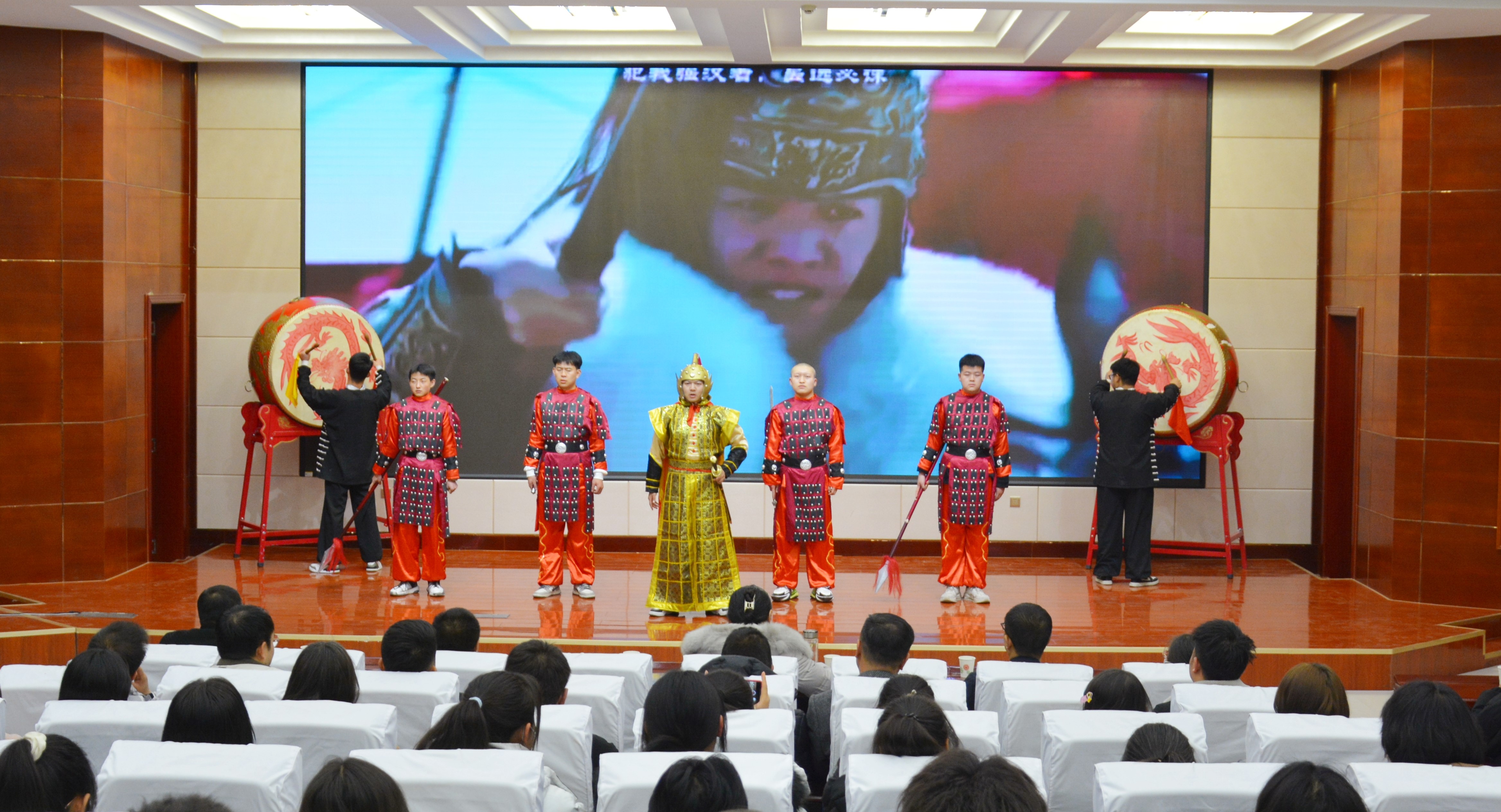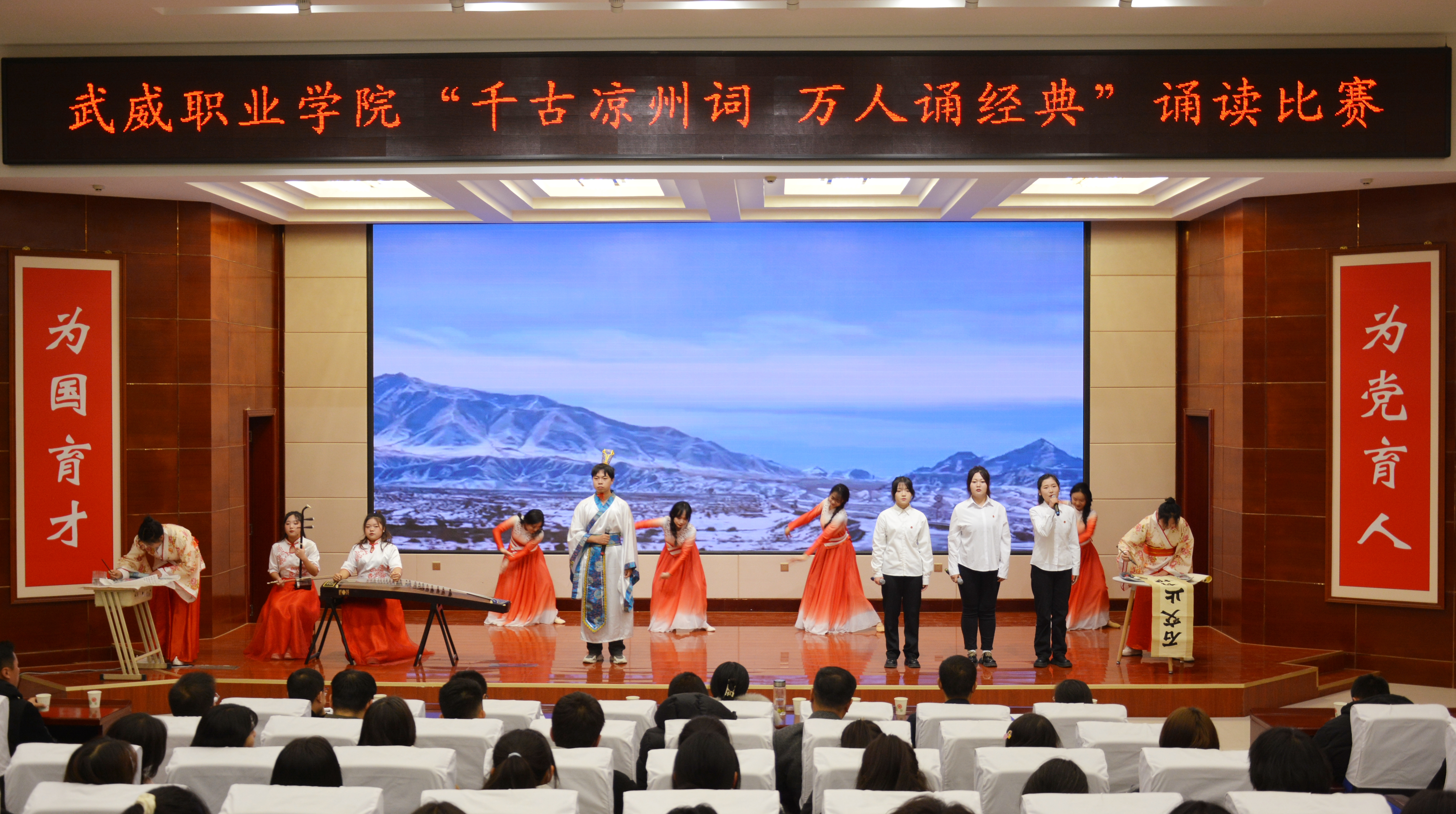 比賽現(xiàn)場精彩紛呈,現(xiàn)場氣氛異常熱烈,掌聲此起彼伏。節(jié)目以詩歌吟誦、伴舞、書法、國畫、武術(shù)、情景表演等豐富多彩的藝術(shù)形式,為現(xiàn)場觀眾打造出一場別開生面的涼州文化視聽盛宴。同學(xué)們激情洋溢,用澎湃真摯的情感演繹著經(jīng)典燦爛的磅礴詩篇,用跨越千年的對話勾勒出雄渾壯烈的漢武雄風(fēng),用鏗鏘有力的旋律編織出蕩氣回腸的時代頌歌,以青春奮斗的初心賡續(xù)著生生不息的五涼文化。