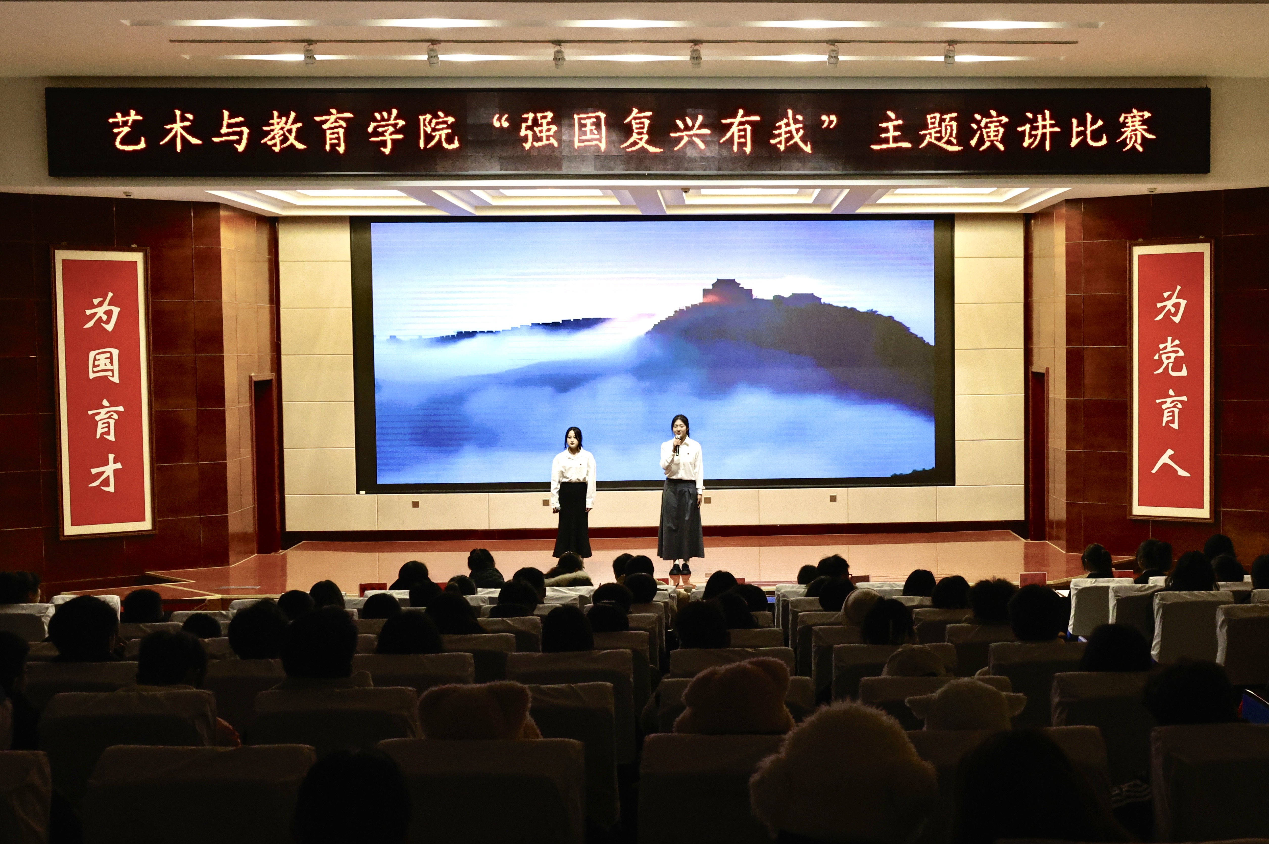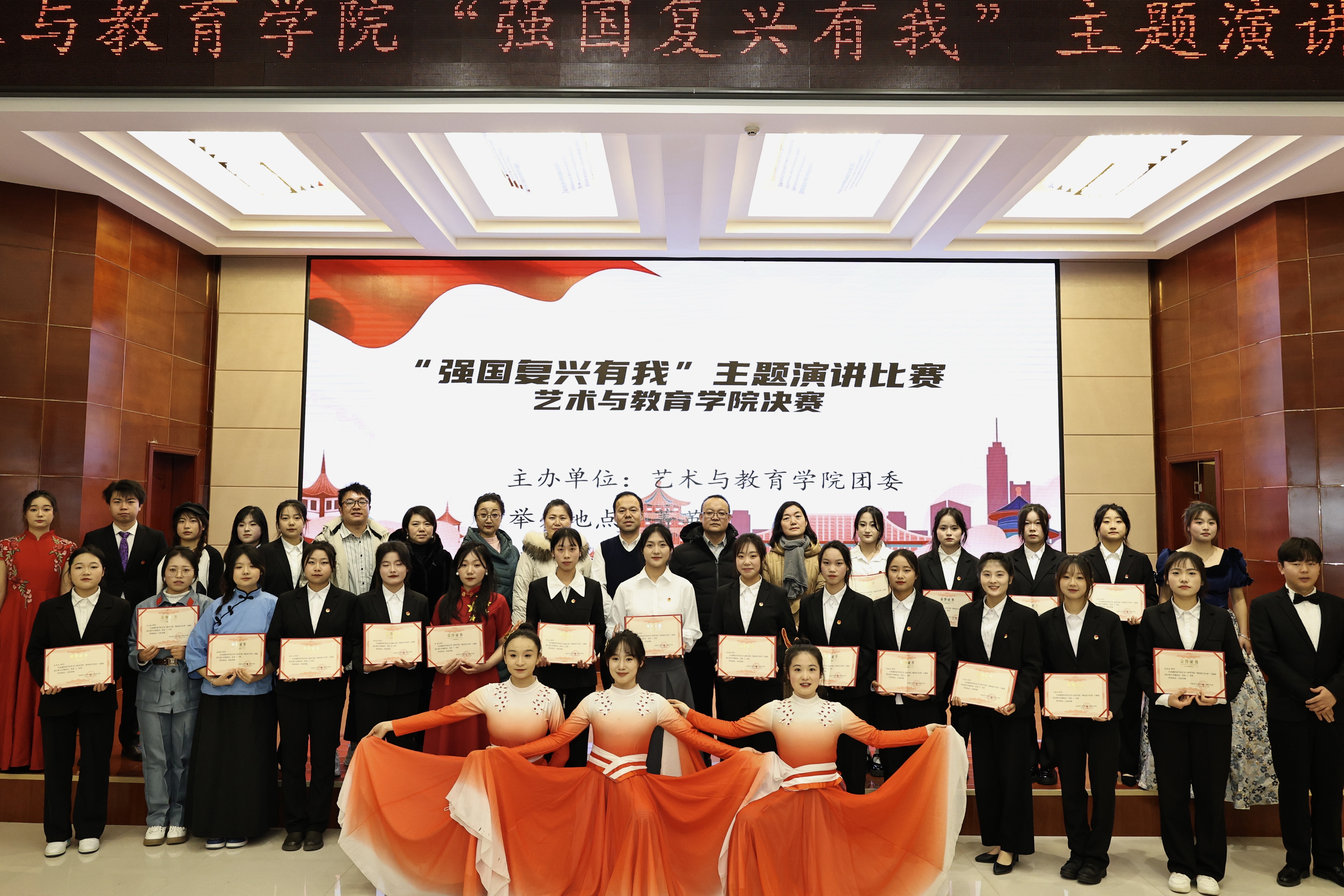 為弘揚(yáng)愛國主義精神,激發(fā)學(xué)生愛國情懷,12月20日晚,藝術(shù)與教育學(xué)院團(tuán)委在菁英廳舉辦“強(qiáng)國復(fù)興有我”主題演講比賽。學(xué)院200余名師生觀看了比賽。