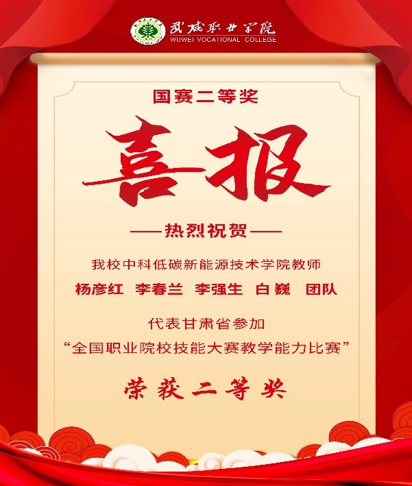 近日,2023年全國職業(yè)院校技能大賽教學(xué)能力比賽決賽在江西現(xiàn)代職業(yè)技術(shù)學(xué)院落下帷幕,由中科低碳新能源學(xué)院教師楊彥紅、李春蘭、李強(qiáng)生、白巍組成的參賽團(tuán)隊(duì)作為甘肅省唯一一支打入國賽決賽的團(tuán)隊(duì),代表甘肅省參加比賽,喜獲專業(yè)課程高職一組二等獎(jiǎng)。