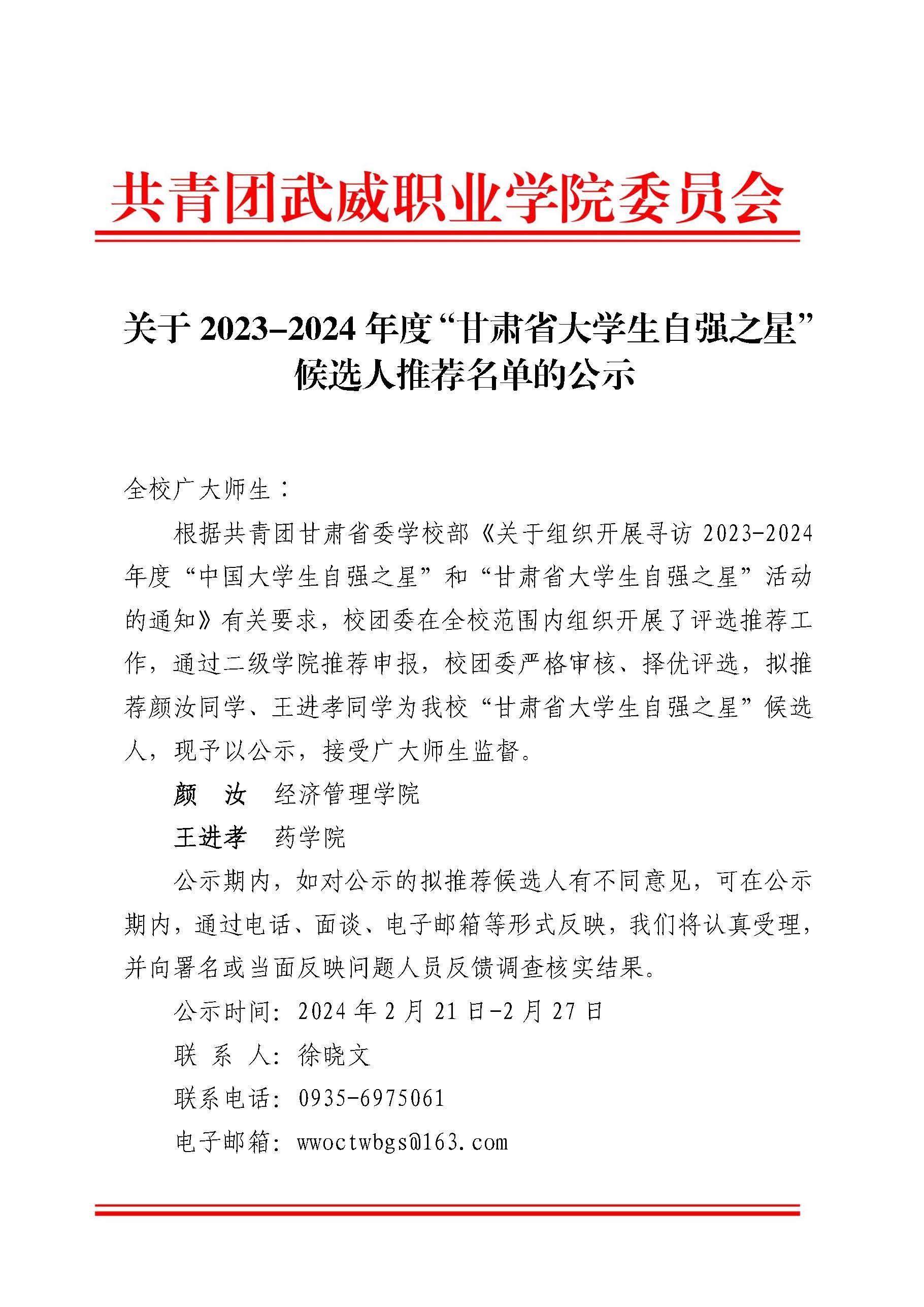 關(guān)于2023-2024年度“甘肅省大學(xué)生自強(qiáng)之星”候選人推薦名單的公示
