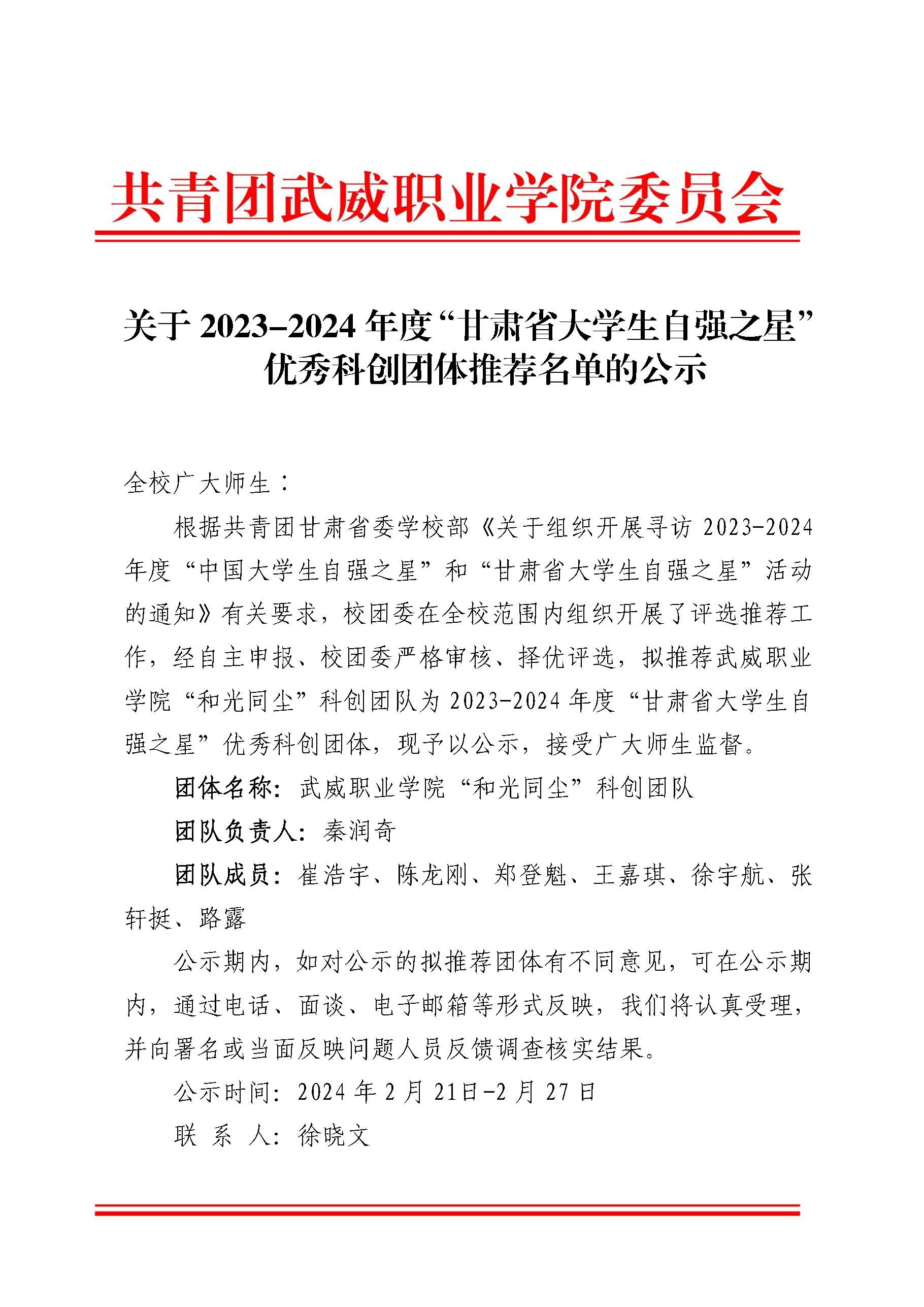 關(guān)于2023-2024年度“甘肅省大學(xué)生自強(qiáng)之星”優(yōu)秀科創(chuàng)團(tuán)體推薦名單的公示