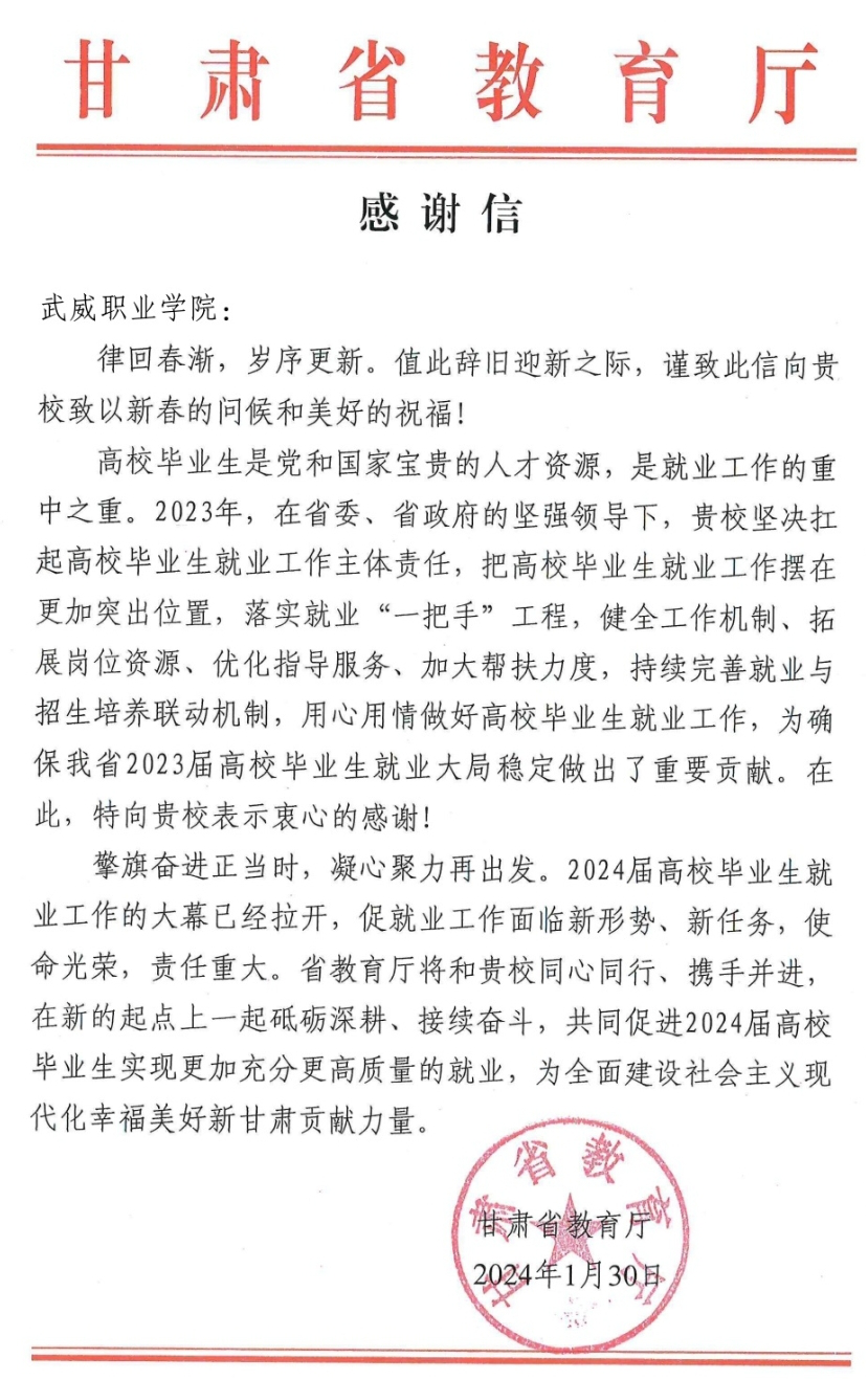 這些感謝信是對學(xué)校畢業(yè)生就業(yè)工作的肯定,也是激勵學(xué)校奮步前行的動力。學(xué)校將繼續(xù)在甘肅省教育廳的指導(dǎo)下,在與社會各界的通力合作下,一起砥礪深耕、接續(xù)奮斗,共同促進2024屆高校畢業(yè)生實現(xiàn)更加充分更高質(zhì)量的就業(yè)。