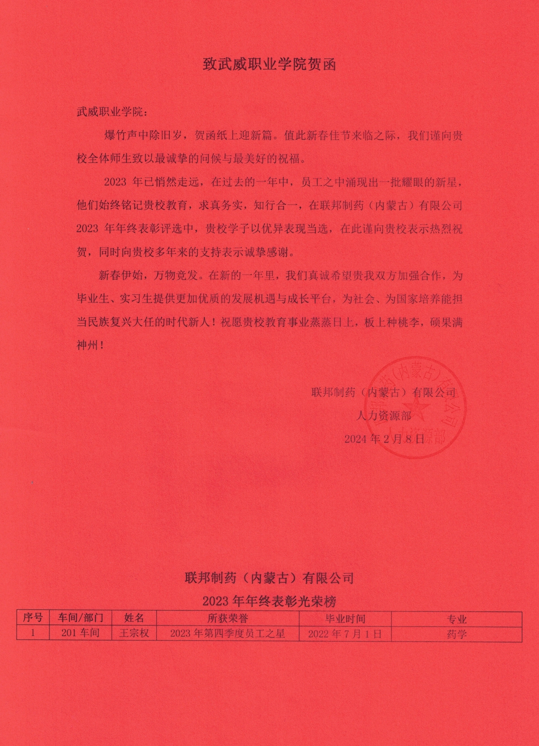 2月初,聯(lián)邦制藥(內(nèi)蒙古)有限公司向?qū)W校發(fā)來賀信,在信中感謝學(xué)校輸送眾多優(yōu)秀畢業(yè)生,表彰畢業(yè)生在工作中取得的優(yōu)異成績。其中,2022屆畢業(yè)生王宗權(quán)榮獲企業(yè)2023年第四季度員工之星。此外,聯(lián)邦制藥(內(nèi)蒙古)有限公司表示愿與學(xué)校繼續(xù)加強校企合作,共同為畢業(yè)生提供更加優(yōu)質(zhì)的發(fā)展機遇與成長平臺,為社會、為國家培養(yǎng)能擔(dān)當民族復(fù)興大任的時代新人!