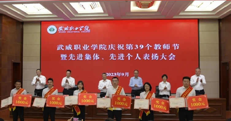 學(xué)校領(lǐng)導(dǎo)分別宣讀了《中共武威職業(yè)學(xué)院委員會(huì)關(guān)于表?yè)P(yáng)2023年教育工作先進(jìn)集體和先進(jìn)個(gè)人的決定》《武威職業(yè)學(xué)院關(guān)于認(rèn)定(聘任)2023年“教書(shū)育人楷?!薄拔易钕矏?ài)的老師”“教學(xué)名師”“教學(xué)能手”“教學(xué)新秀”“骨干教師”“專(zhuān)業(yè)帶頭人”的決定》,向國(guó)獎(jiǎng)獲獎(jiǎng)團(tuán)隊(duì)代表、優(yōu)秀教師代表頒發(fā)榮譽(yù)證書(shū)并發(fā)放慰問(wèn)金。