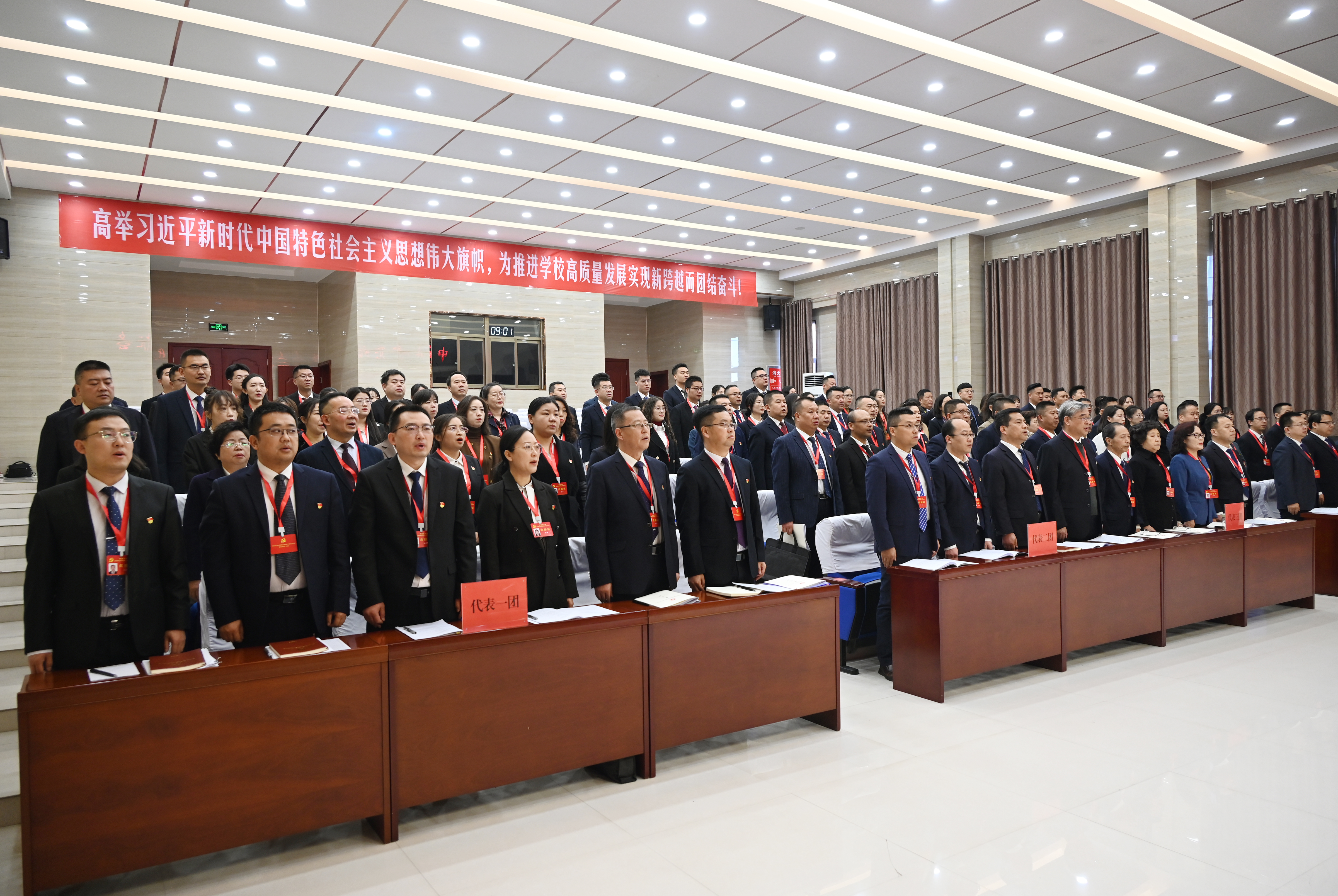 上午9時,大會在莊嚴的國歌聲中拉開帷幕。王宏宣布中國共產(chǎn)黨武威職業(yè)學(xué)院第二次代表大會正式開幕。