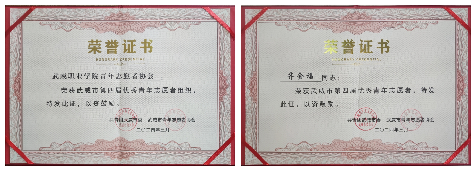 會議全面總結(jié)了2023年全市青年志愿服務工作情況,對獲得武威市第四屆優(yōu)秀志愿者組織和個人的集體和單位頒發(fā)榮譽證書。我校青年志愿者協(xié)會被評為“優(yōu)秀志愿者組織”,工程技術(shù)學院學生齊金福被評為“優(yōu)秀志愿者”。