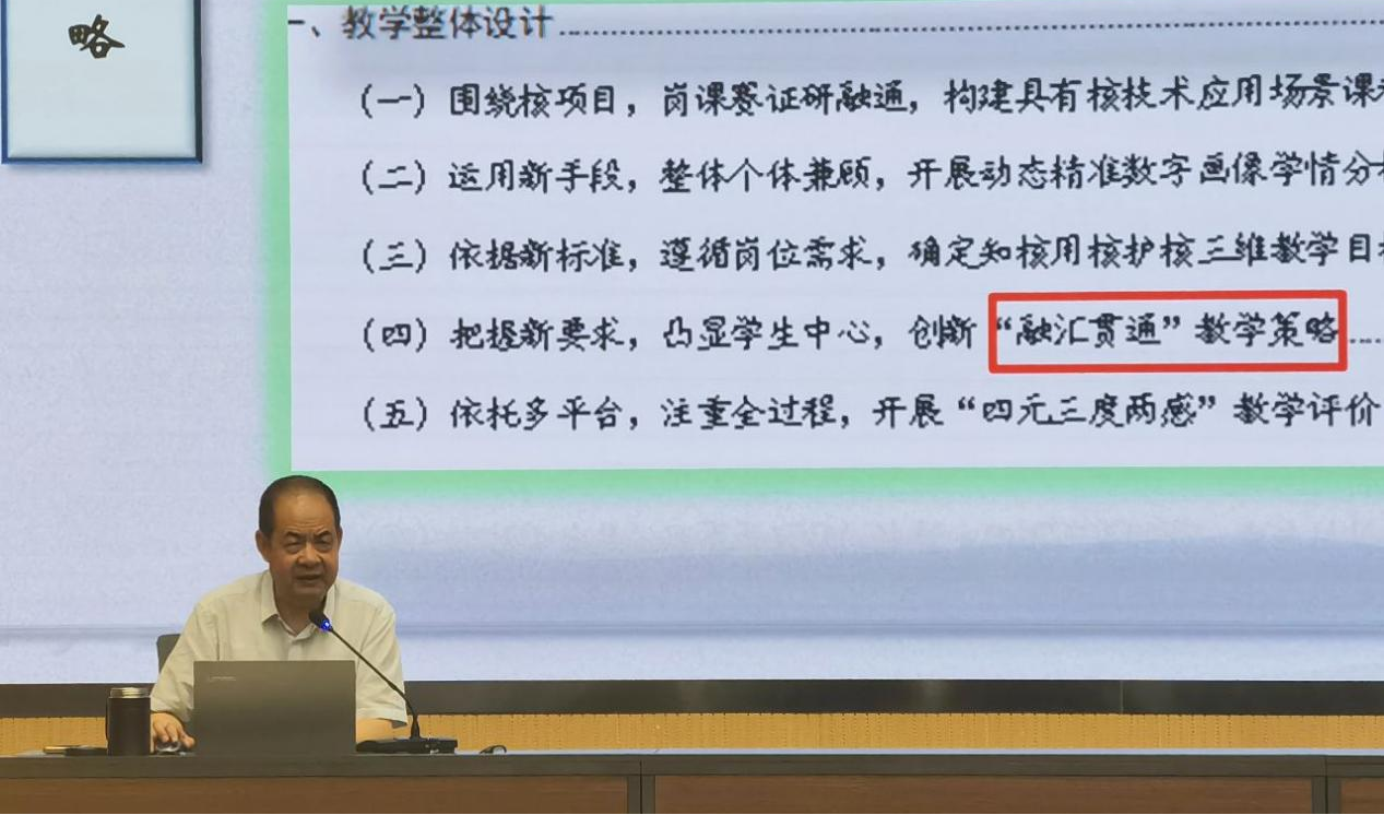翟存祥以“獲獎作品是如何打磨的——以2023年核技術(shù)應(yīng)用作品為例”為題,對標國家教學能力大賽標準,總結(jié)參賽經(jīng)驗,對比賽中教學團隊的組建、參賽項目的選題、人才培養(yǎng)方案的完善、課程標準的制訂、教學實施方案和教案撰寫、課堂實錄視頻的拍攝以及賽場答辯的準備做了深入細致的分析。