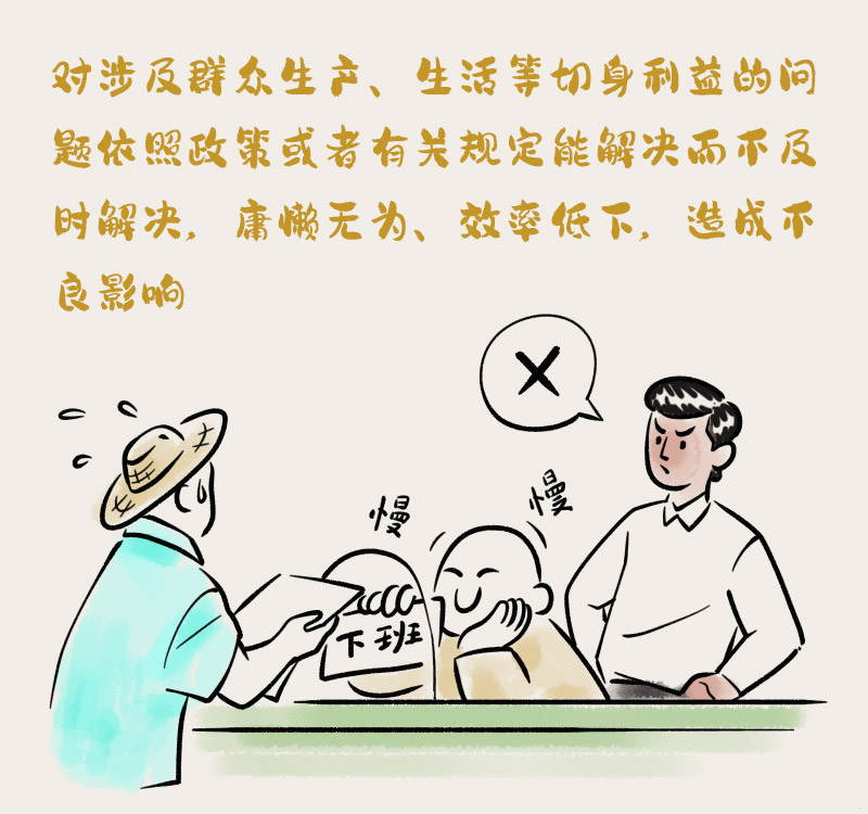 (一)對涉及群眾生產(chǎn)、生活等切身利益的問題依照政策或者有關規(guī)定能解決而不及時解決,庸懶無為、效率低下,造成不良影響;
