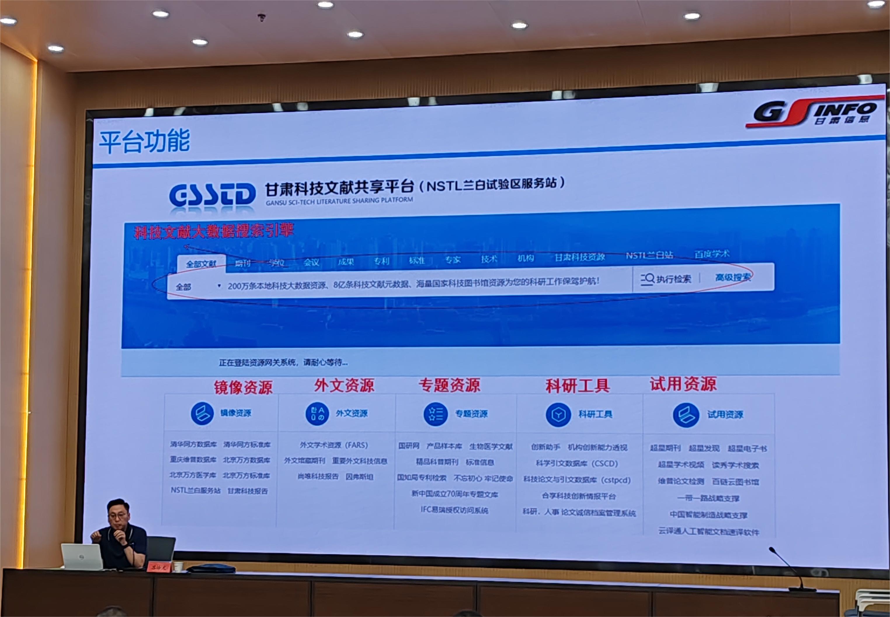 蘇海龍研究員以《如何利用科技文獻提升科研創(chuàng)新能力》為主題開展講座。講座分別從科技文獻的重要性、平臺功能及數(shù)據(jù)資源、醫(yī)學科研創(chuàng)新與文獻保障、科研相關問題和實際操作演示幾個方面講述科研項目申報中文獻檢索與文獻查閱的重要性,并介紹了甘肅科技文獻共享平臺,展示了平臺的檢索功能,為大家拓寬了文獻檢索的渠道,提升了教師信息檢索能力。