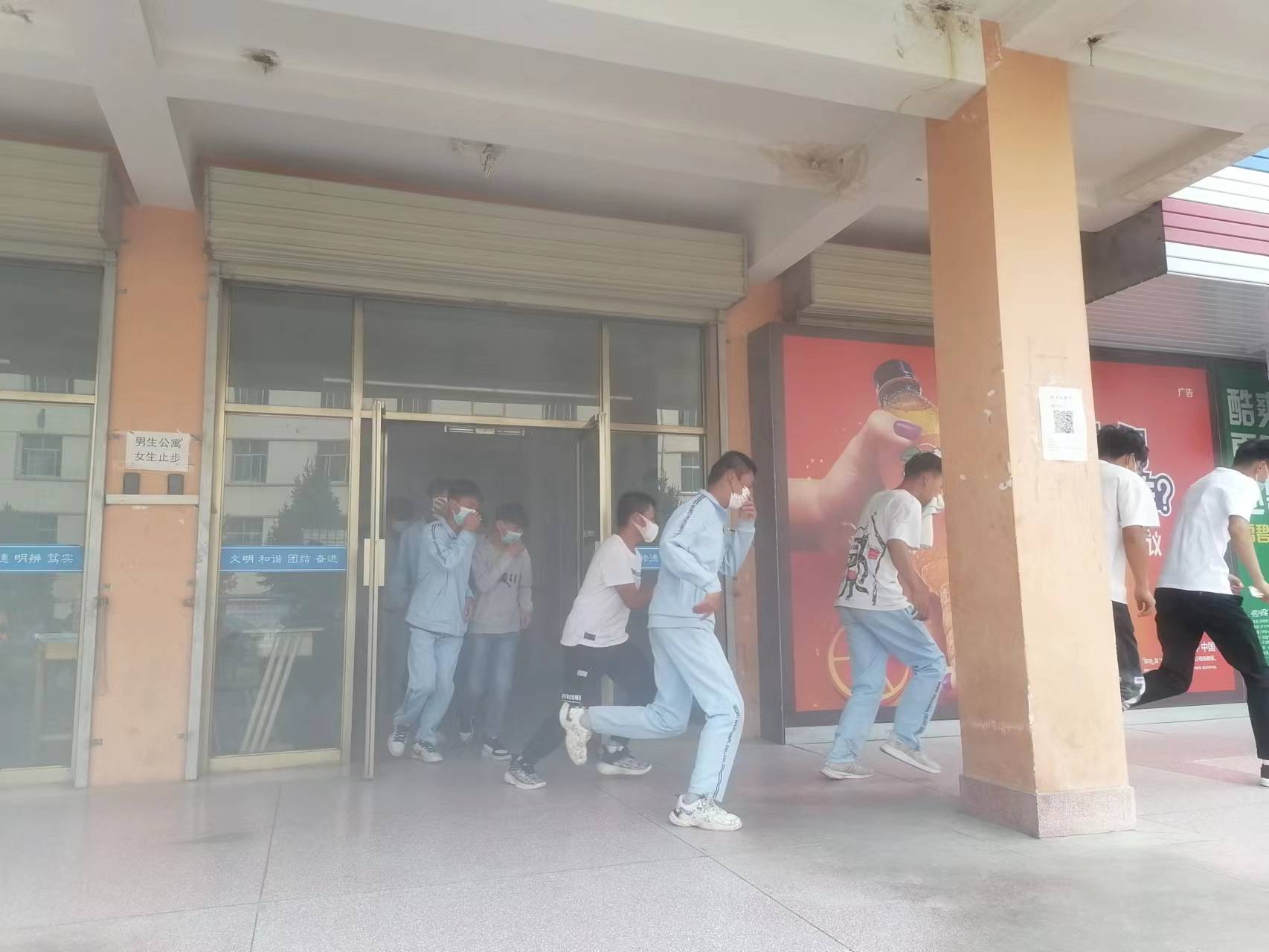 15時20分,疏散演練正式開始。隨著火災(zāi)警報響起,安全保衛(wèi)工作人員點燃煙餅,在學(xué)生公寓樓模擬火災(zāi)現(xiàn)場,冒出滾滾濃煙,公寓管理人員迅速組織學(xué)生有序疏散。在輔導(dǎo)員、班主任的引導(dǎo)下,同學(xué)們按照動作要領(lǐng),用濕毛巾捂住口鼻,俯身彎腰按照安全出口指示牌快速、有序從疏散通道撤離到體育場,整個過程緊張有序,實用性強,達(dá)到了預(yù)期效果。