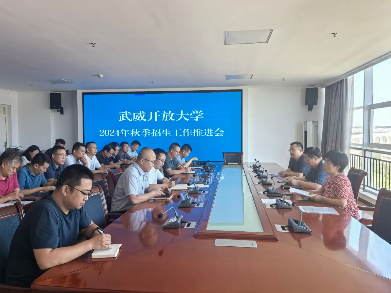 為進一步提升招生工作潛能、規(guī)范招生工作管理、創(chuàng)新招生工作思路,推動招生工作取得新成效。8月15日上午,武威開放大學召開了2024年秋季招生工作推進會。校長張開禮及其他在家校領導、全體中層干部及武威職業(yè)學院各部門和二級學院負責人參加會議,會議由副校長何毅主持。