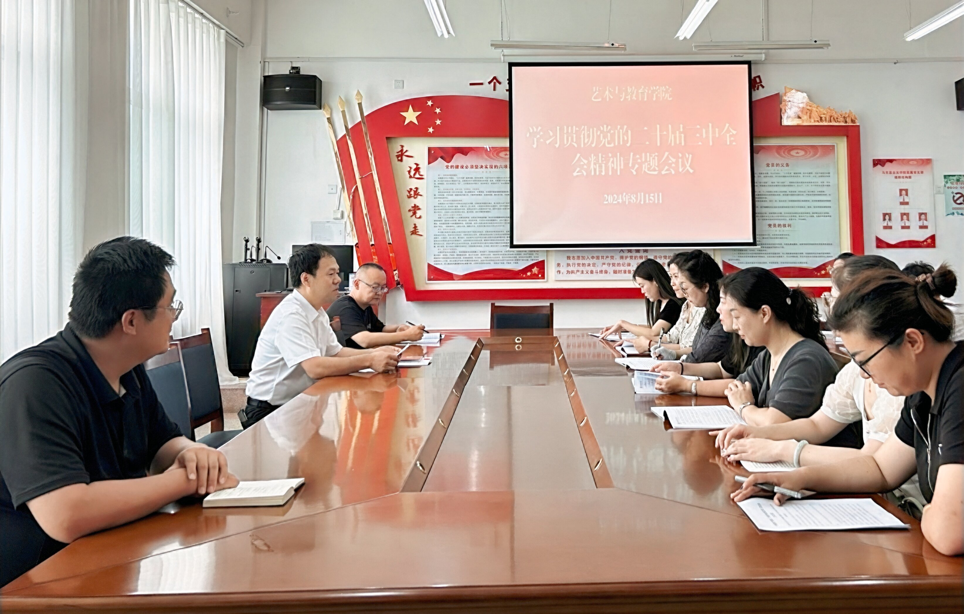 8月15日,藝術(shù)與教育學(xué)院召開黨的二十屆三中全會精神專題學(xué)習(xí)會議,傳達(dá)學(xué)習(xí)《習(xí)近平總書記關(guān)于<中共中央關(guān)于進(jìn)一步全面深化改革、推進(jìn)中國式現(xiàn)代化的決定>的說明》《中國共產(chǎn)黨第二十屆中央委員會第三次全體會議公報》《中共中央關(guān)于進(jìn)一步全面深化改革推進(jìn)中國式現(xiàn)代化的決定》,以及《深化教育綜合改革》等內(nèi)容。會議由學(xué)院黨總支書記王政主持,全體教職工參加會議。