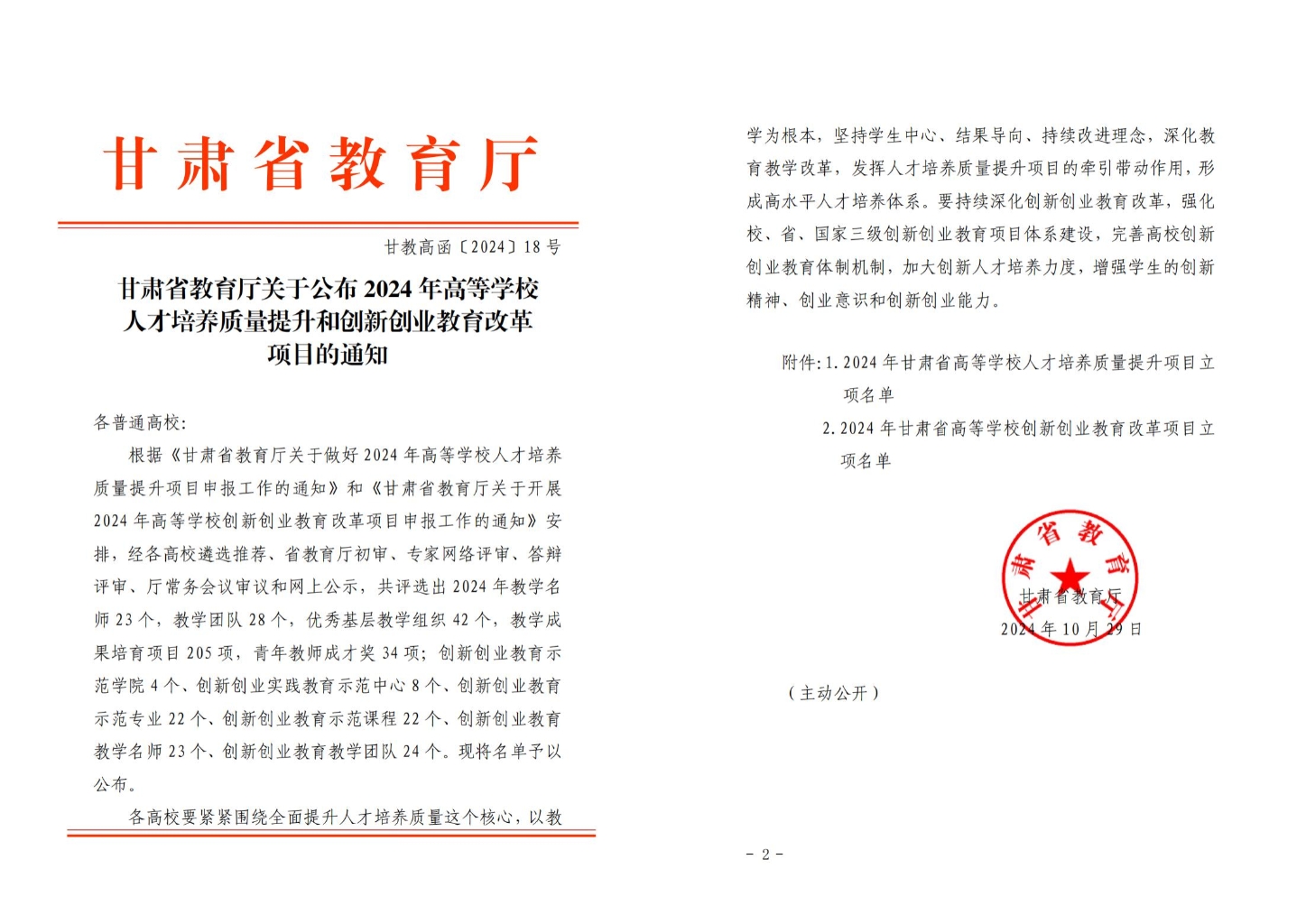 創(chuàng)新創(chuàng)業(yè)教育改革項目是為深入貫徹落實《國務(wù)院辦公廳關(guān)于進一步支持大學(xué)生創(chuàng)新創(chuàng)業(yè)的指導(dǎo)意見》(國辦發(fā)〔2021〕35 號)、《甘肅省教育廳等十三部門印發(fā)〈甘肅省關(guān)于進一步支持大學(xué)生創(chuàng)新創(chuàng)業(yè)的若干措施〉的通知》(甘教高〔2022〕3 號)等精神,推動全省高等學(xué)校持續(xù)深化創(chuàng)新創(chuàng)業(yè)教育改革,主動融入產(chǎn)業(yè)轉(zhuǎn)型升級和創(chuàng)新驅(qū)動發(fā)展戰(zhàn)略,提高人才培養(yǎng)質(zhì)量的重要舉措。本次認定的4項創(chuàng)新創(chuàng)業(yè)教育改革項目,是對我校創(chuàng)新創(chuàng)業(yè)工作的肯定,也對學(xué)校高質(zhì)量發(fā)展,提升人才培養(yǎng)質(zhì)量具有重要的推動作用。