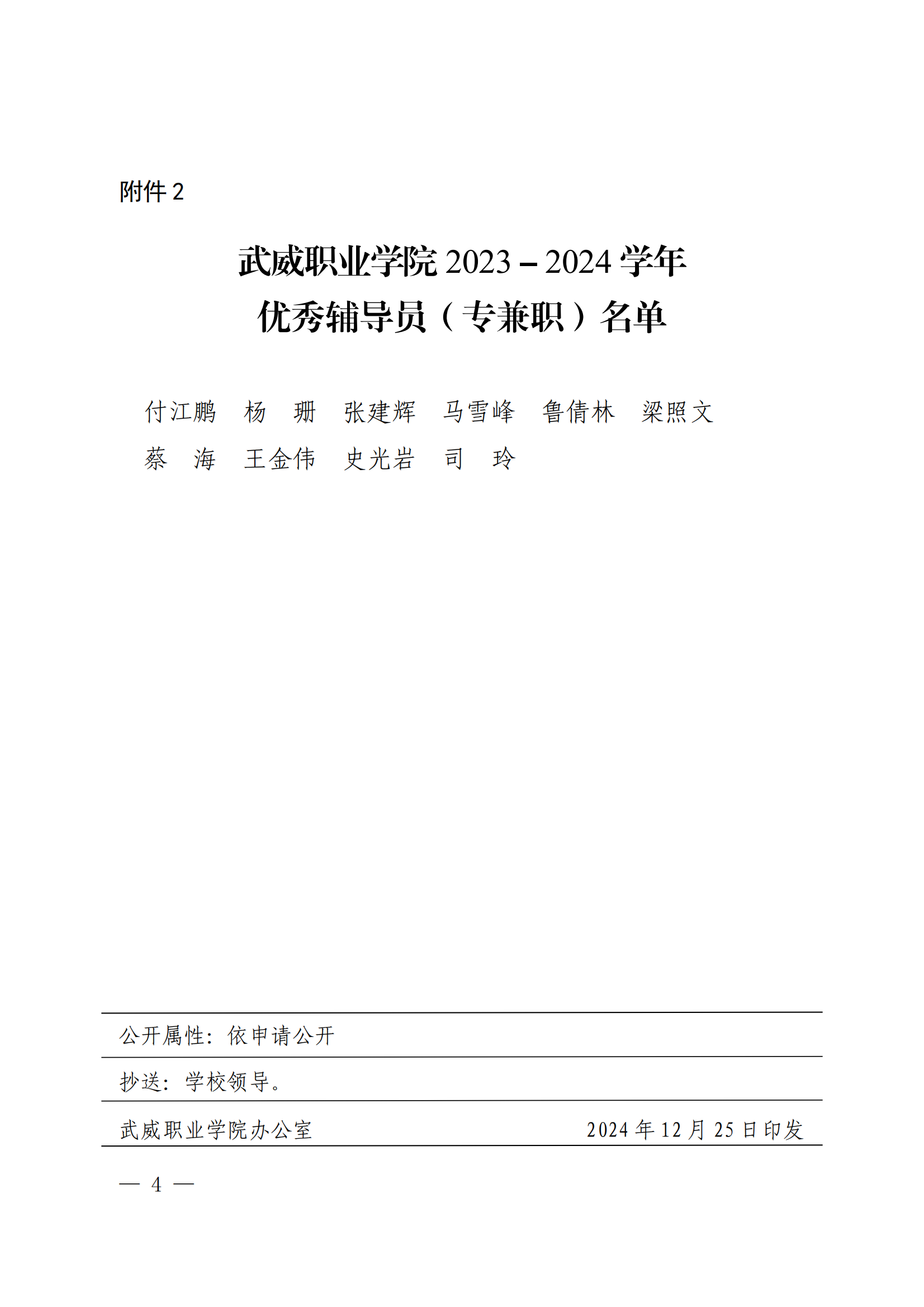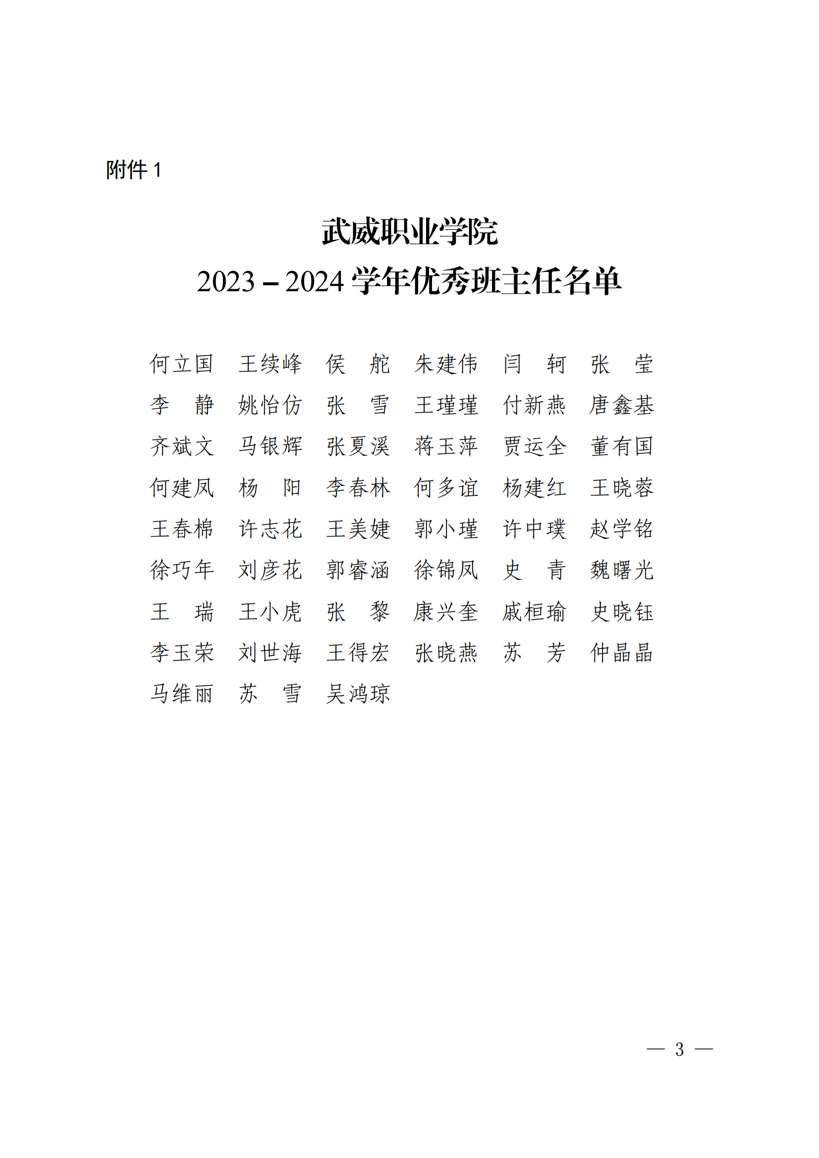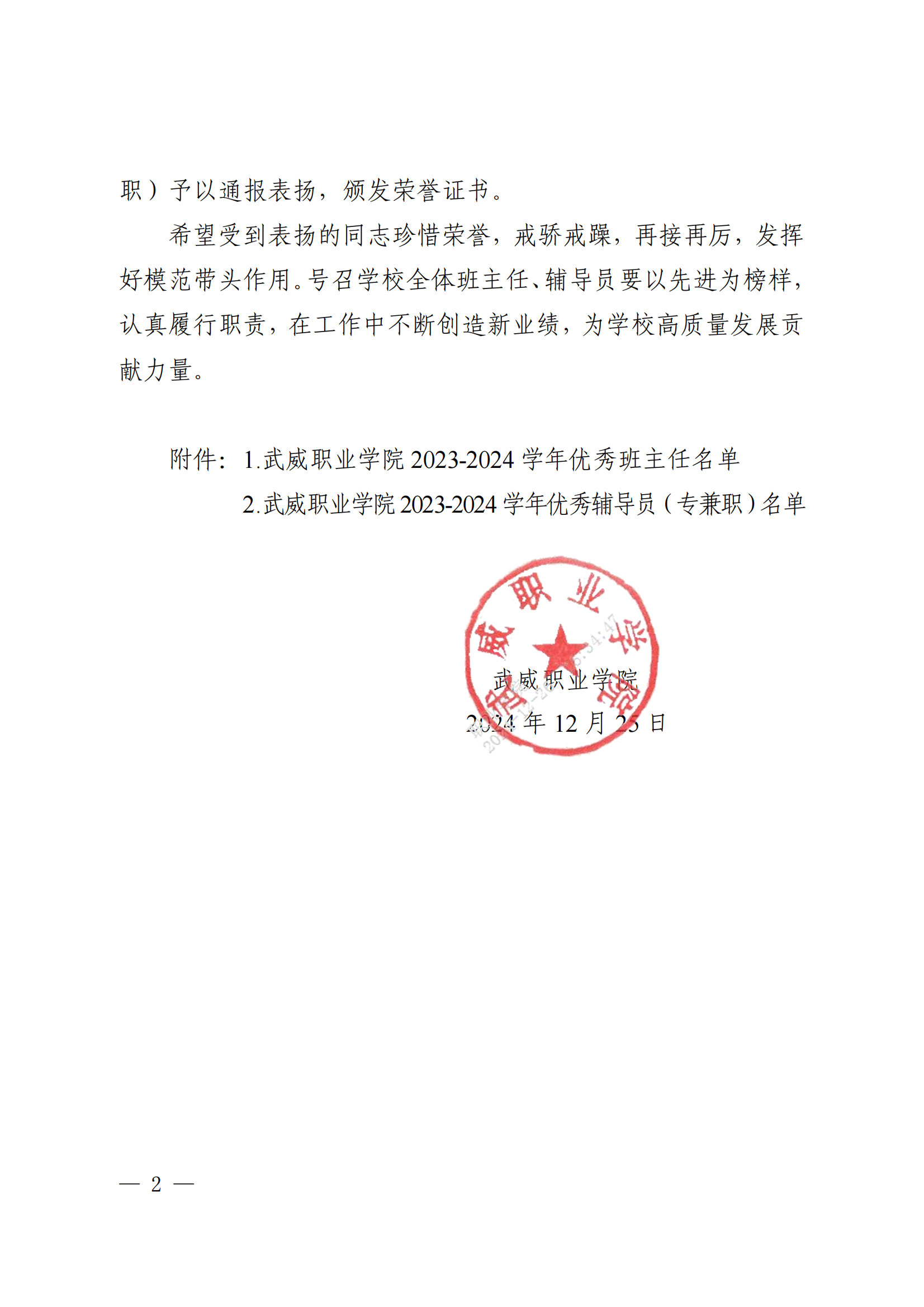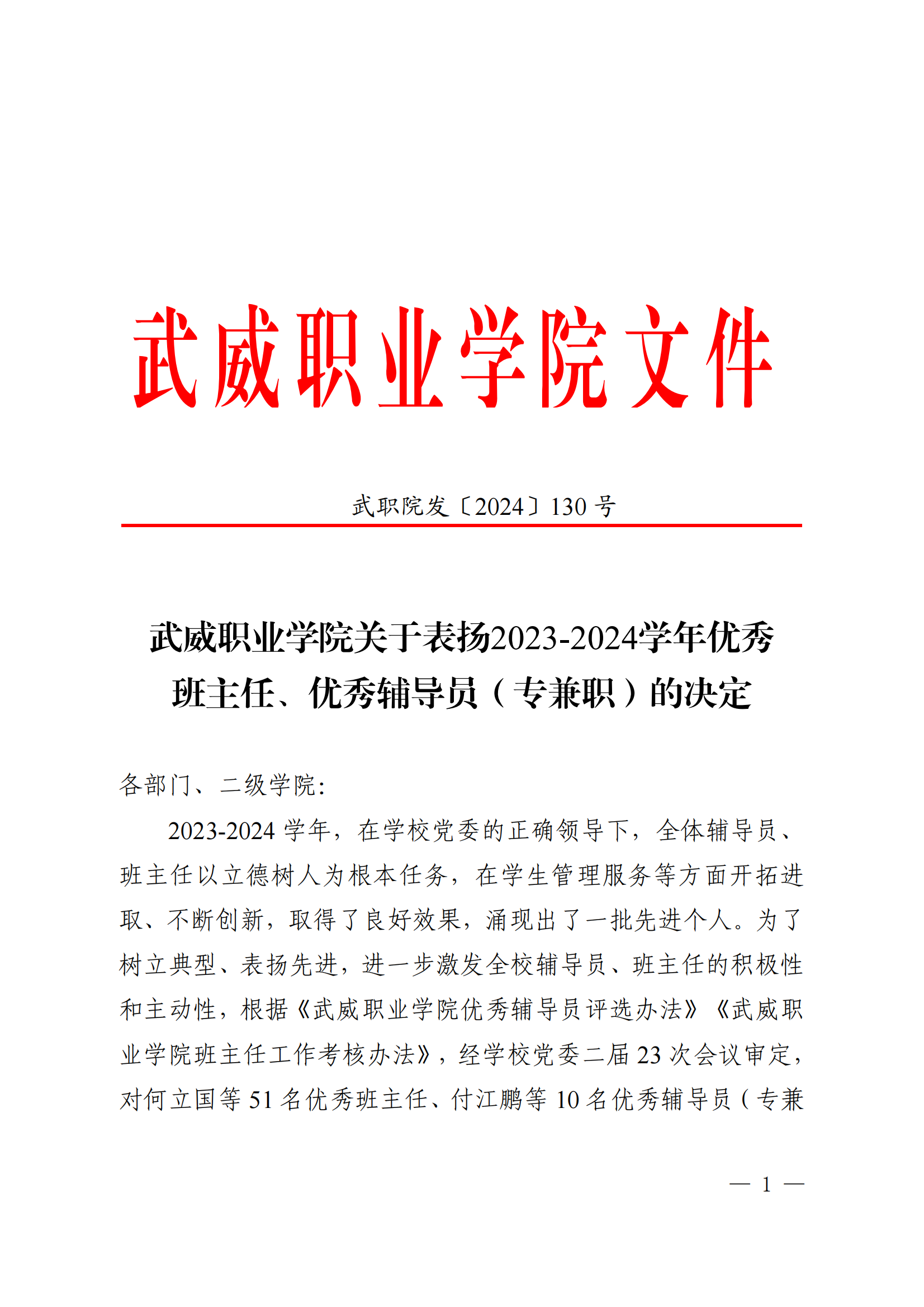 武威職業(yè)學(xué)院關(guān)于表揚2023-2024學(xué)年優(yōu)秀班主任、優(yōu)秀輔導(dǎo)員(專兼職)的決定