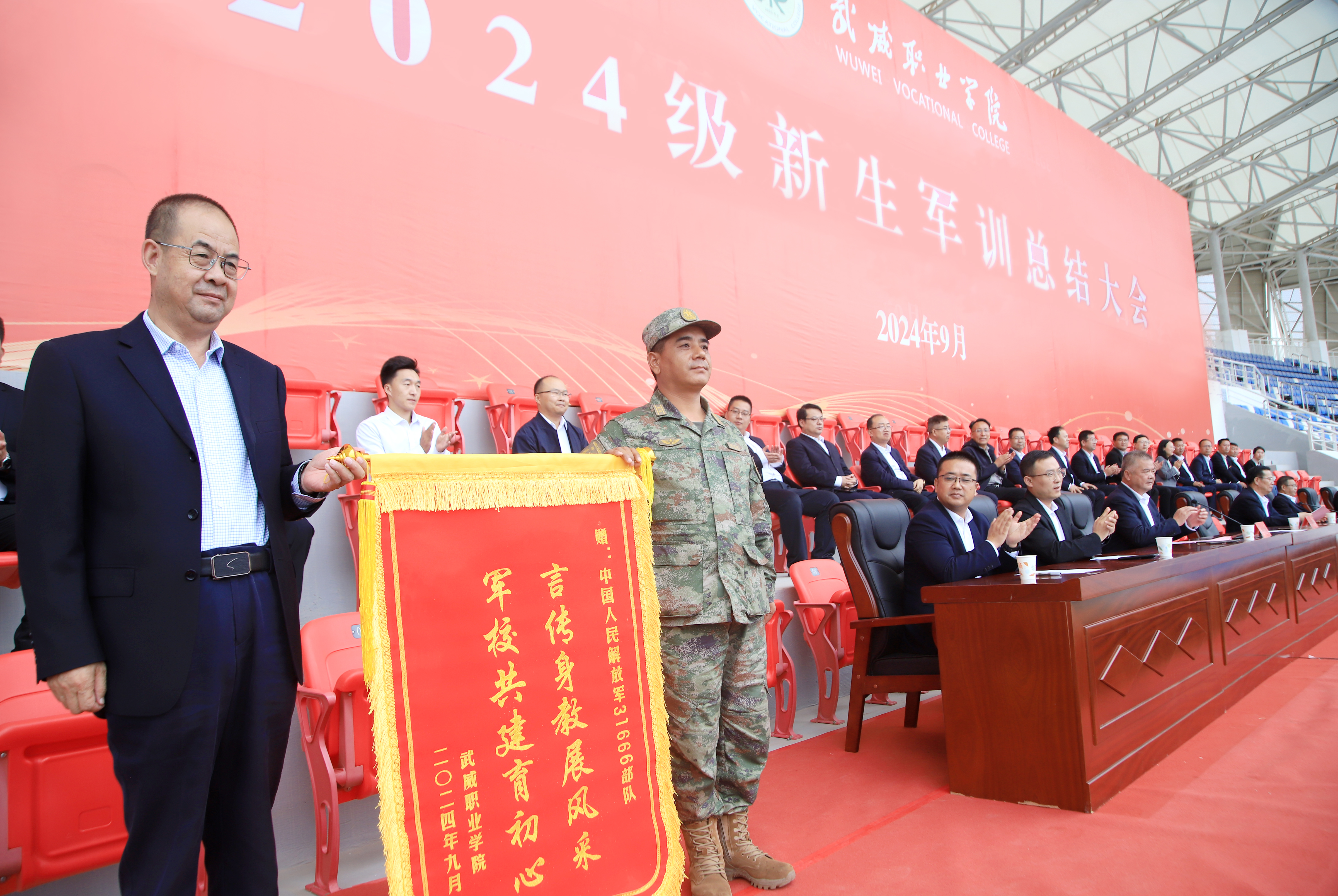 會上,翟存祥代表學(xué)校向承訓(xùn)部隊贈送錦旗致以崇高的敬意,向奮戰(zhàn)在訓(xùn)練一線的軍訓(xùn)教官及工作人員表示衷心的感謝!陳曉煜宣讀了2024級新生軍訓(xùn)工作先進(jìn)集體、先進(jìn)個人、優(yōu)秀教官和軍訓(xùn)標(biāo)兵擬表彰名單。與會領(lǐng)導(dǎo)為軍訓(xùn)先進(jìn)集體和個人頒發(fā)了獎牌和榮譽(yù)證書。