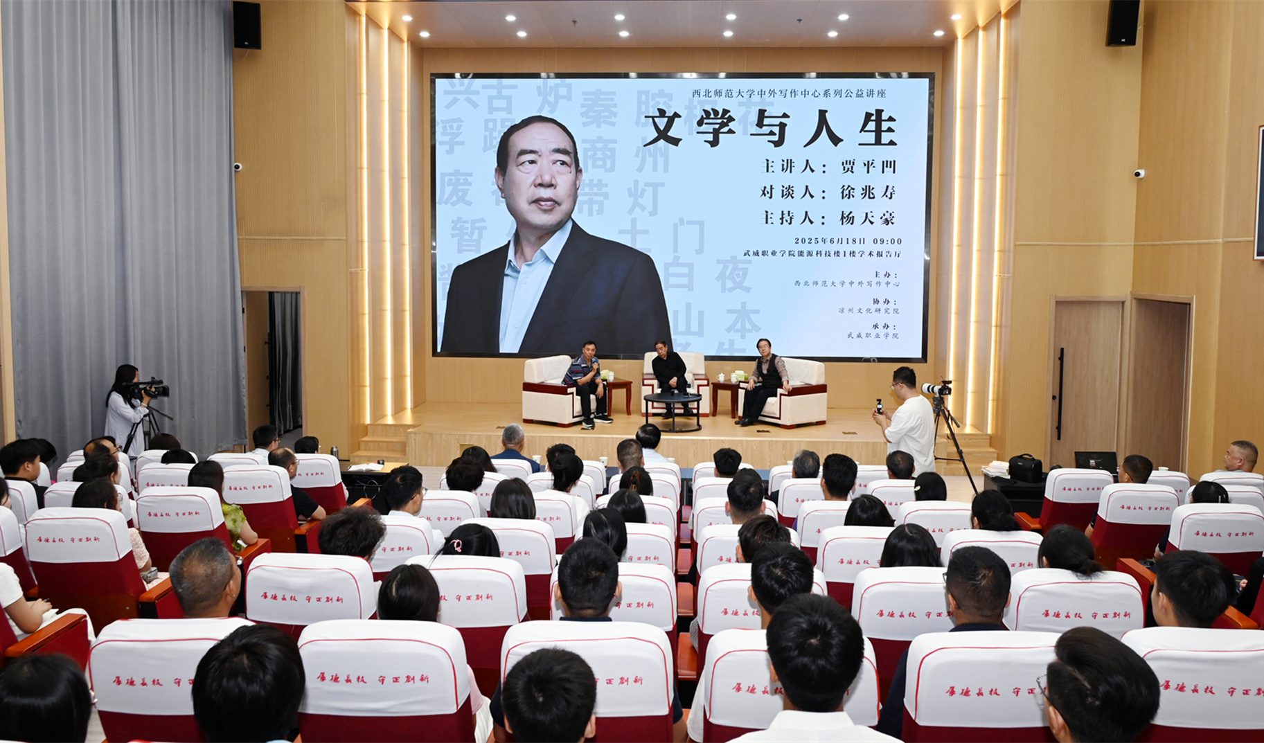 近日,西北師范大學(xué)中外寫作中心武威基地“文學(xué)與人生”公益講座在武威職業(yè)技術(shù)大學(xué)舉辦。著名作家、西北師范大學(xué)特聘教授賈平凹擔(dān)任主講嘉賓,寫作中心常務(wù)副主任徐兆壽教授擔(dān)任對談嘉賓,與師生共赴一場思想文化盛宴。講座由西北師范大學(xué)中外寫作中心副主任楊天豪主持。