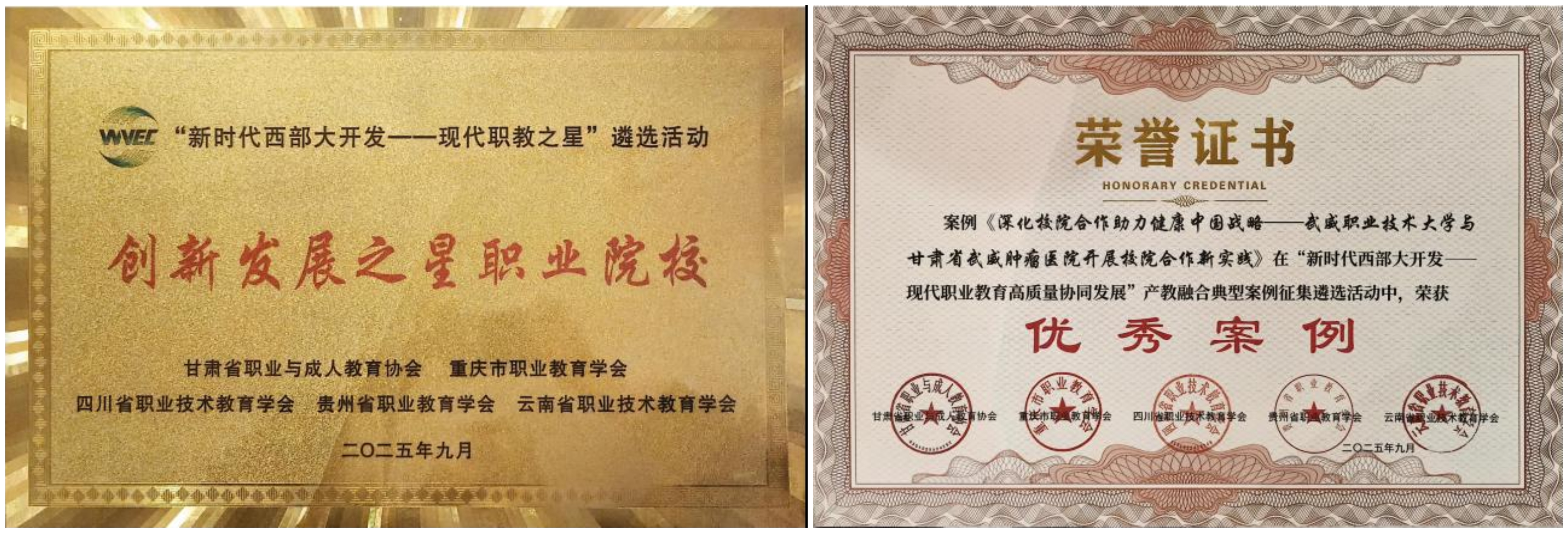 近日,從“新時代西部大開發(fā)——現(xiàn)代職業(yè)教育高質(zhì)量協(xié)同發(fā)展(蘭州)大會”上傳來喜訊,武威職業(yè)技術(shù)大學(xué)在甘肅省職業(yè)與成人教育協(xié)會組織的“新時代西部大開發(fā)——現(xiàn)代職教之星”和“新時代西部大開發(fā)——產(chǎn)教融合典型案例”征集遴選活動中榮獲兩項重要榮譽。學(xué)校獲評“創(chuàng)新發(fā)展之星職業(yè)院校”,《深化校院合作助力健康中國戰(zhàn)略——武威職業(yè)技術(shù)大學(xué)與甘肅省武威腫瘤醫(yī)院開展校院合作新實踐》榮獲“產(chǎn)教融合典型案例優(yōu)秀案例”。