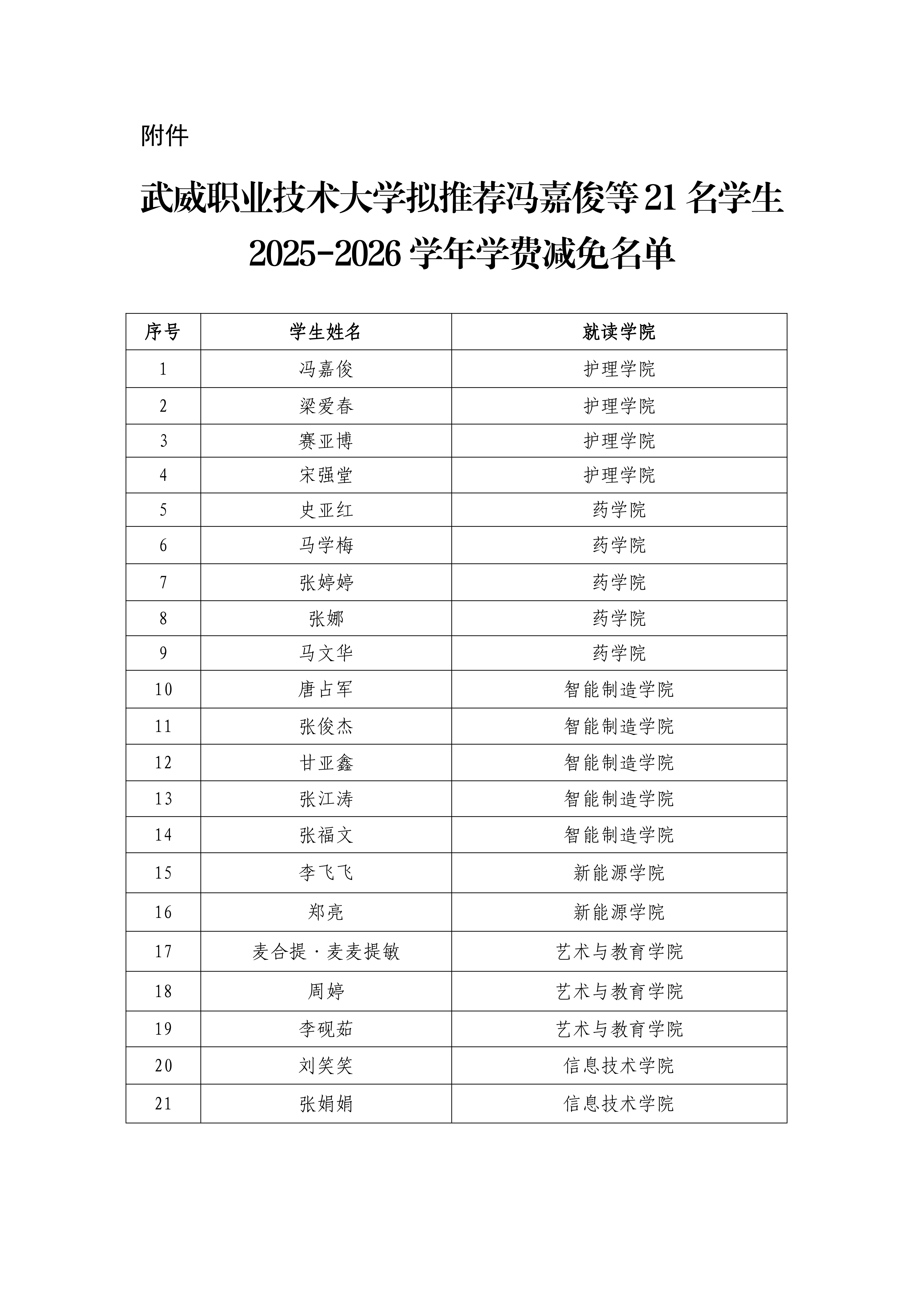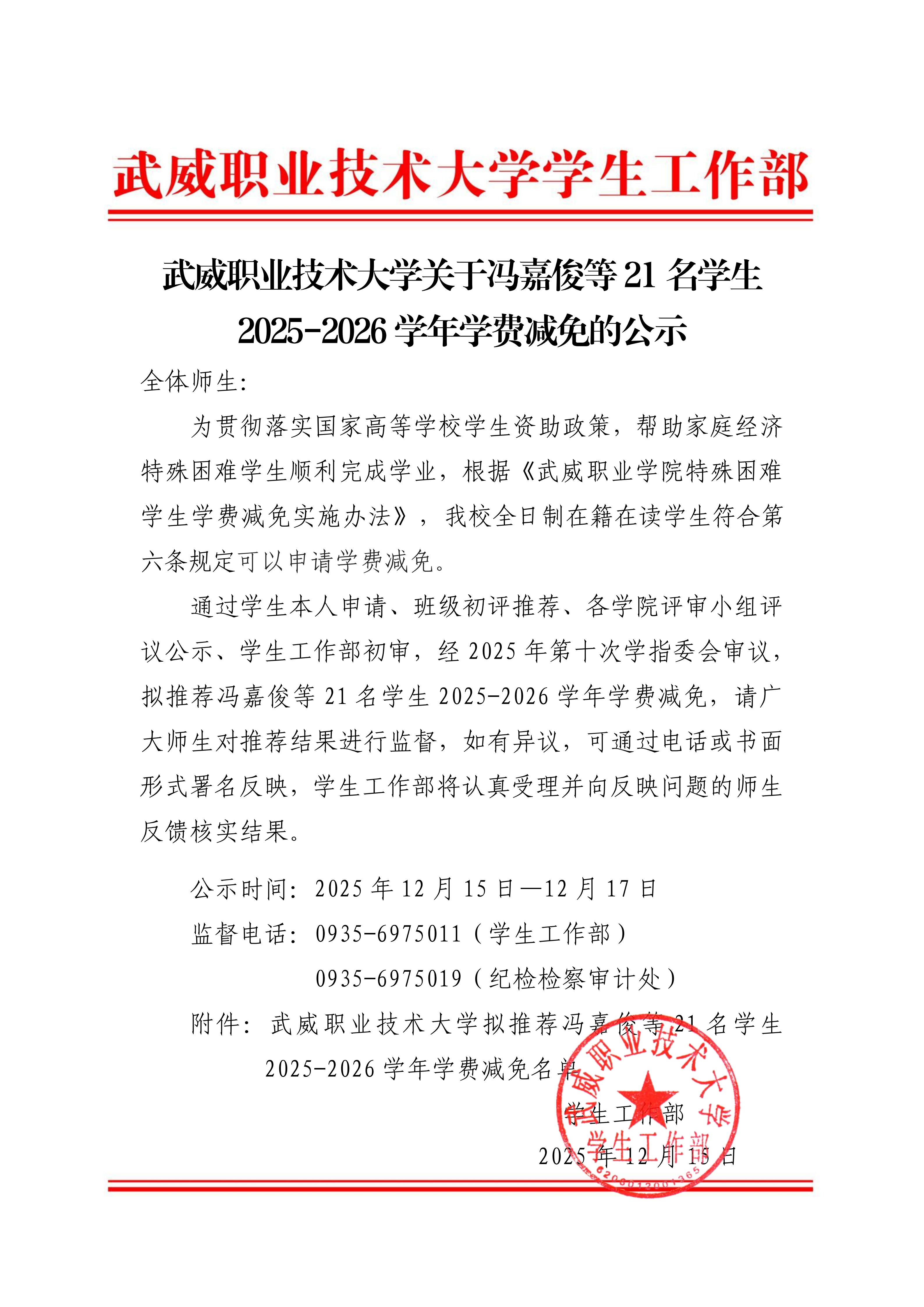 武威職業(yè)技術(shù)大學關(guān)于馮嘉俊等21名學生2025-2026學年學費減免的公示