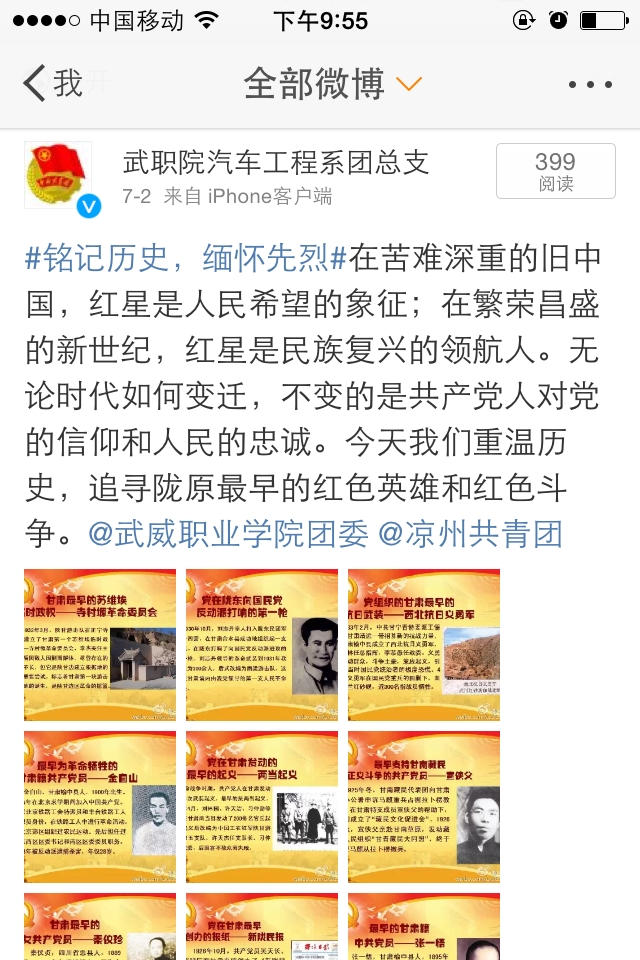 新媒體是對團員青年進(jìn)行宣傳教育的一塊重要的輿論陣地,汽車工程系團總支通過青媒中心設(shè)立的微信公眾平臺、新浪微博、QQ空間等多種手段,通過發(fā)布中國人民抗戰(zhàn)歷史知識、設(shè)立紀(jì)念抗日戰(zhàn)爭70周年話題等多種形式,以圖文并茂的方式給團員青年進(jìn)行了一次中國人民抗戰(zhàn)大普及和大討論,使團員青年在學(xué)習(xí)知識和討論觀點中,堅定理想信念,培養(yǎng)愛國情操、樹立歷史使命、珍惜美好生活、勿忘國恥,展望未來。