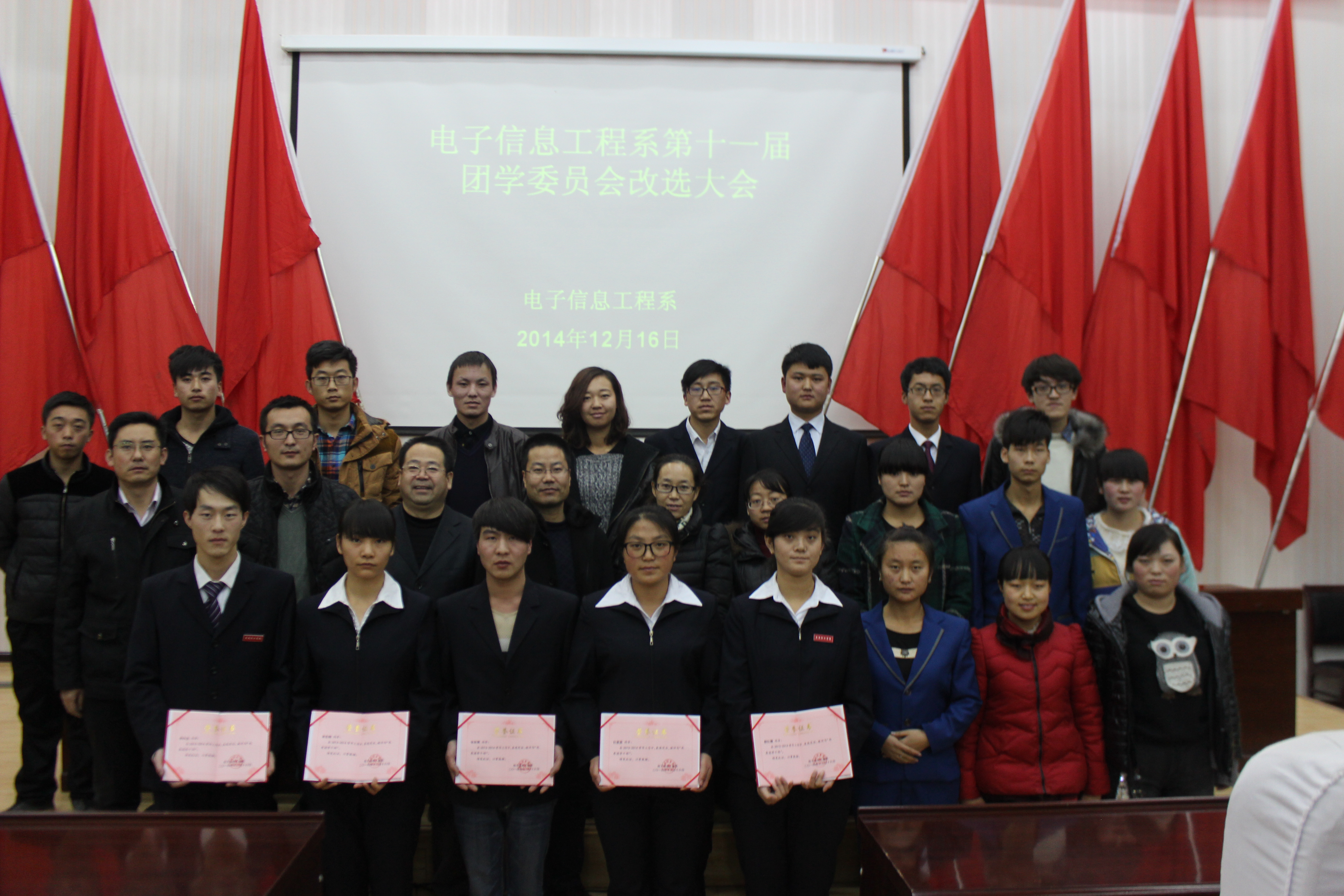 系主任白玉珍對(duì)我系團(tuán)學(xué)工作給予了高度的評(píng)價(jià),對(duì)上一屆團(tuán)總支學(xué)生會(huì)優(yōu)秀學(xué)生干部進(jìn)行了表彰并頒發(fā)了榮譽(yù)證書。最后系書記張伯成致閉幕詞,認(rèn)為我系團(tuán)學(xué)工作緊密圍繞學(xué)風(fēng)建設(shè)這一中心,著力推進(jìn)對(duì)學(xué)生的各項(xiàng)服務(wù),開展了一系列富有特色的活動(dòng),取得了良好的成效。他還對(duì)我系的團(tuán)學(xué)工作提出了新的要求,希望新一屆團(tuán)學(xué)干部做到加強(qiáng)政治理論學(xué)習(xí),做好模范帶頭作用,克服困難,團(tuán)結(jié)一致,服務(wù)好全系學(xué)生,為實(shí)現(xiàn)電子信息工程系學(xué)生工作新的跨越努力。