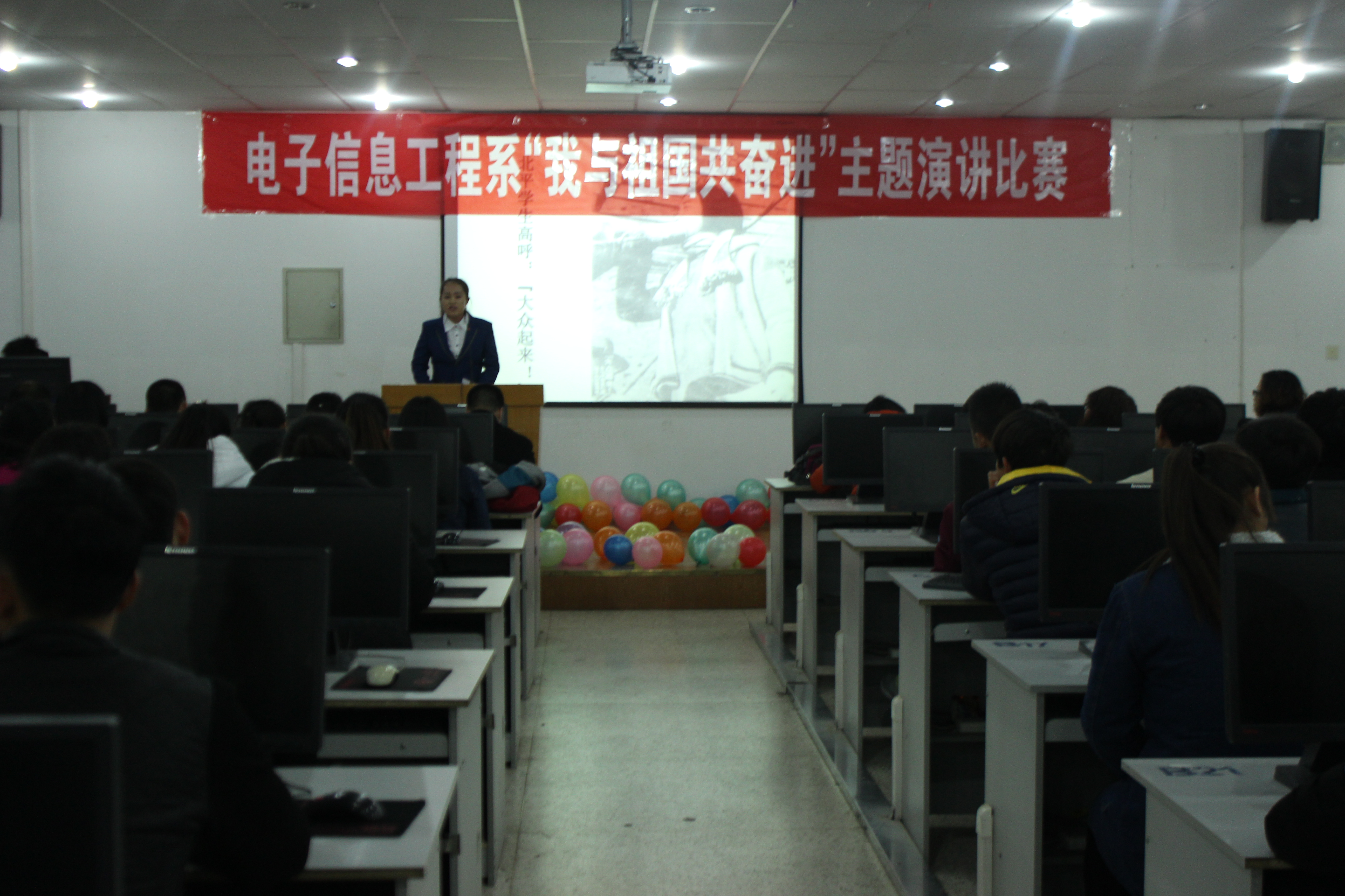 為紀念“12·9”學生愛國運動80周年,激發(fā)我系青年學生的愛國熱情和報國之志,進一步培育和踐行社會主義核心價值觀,提高學生思想政治素質,12月6日晚,電子信息工程系在尚德樓11號機房舉辦了“我與祖國共奮進”主題演講比賽。電子信息工程系黨總支書記張伯成、輔導員鄧偉華、團總支書記唐宗舜、全體班主任及系團總支180多名團員青年觀看了比賽。