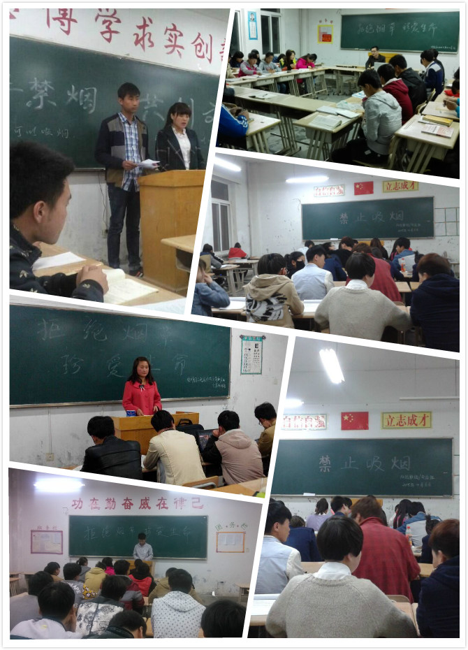 在班會(huì)中,各班主任向同學(xué)們宣讀了學(xué)院《關(guān)于在校園內(nèi)公共場(chǎng)所戒煙的通知》和《校園禁煙倡議書(shū)》,并提出作為一名學(xué)生,除了要有遠(yuǎn)大的理想、高尚的情操、淵博的知識(shí)、嚴(yán)謹(jǐn)?shù)募o(jì)律作風(fēng)外,還要有一個(gè)健康的身體。為了我們的健康,我們呼吁,同學(xué)們應(yīng)自覺(jué)的遠(yuǎn)離香煙,并勸說(shuō)吸煙的親友盡快戒煙。讓我們每一位同學(xué)做出承諾,自覺(jué)拒絕煙草,遠(yuǎn)離煙草危害。堅(jiān)決不吸煙,拒吸第一支煙,勸告他人不吸煙,不做吸煙的新一代。人人爭(zhēng)做文明、健康、遵紀(jì)守法的好學(xué)生,使每一位師生都擁有一個(gè)健康的生活環(huán)境。