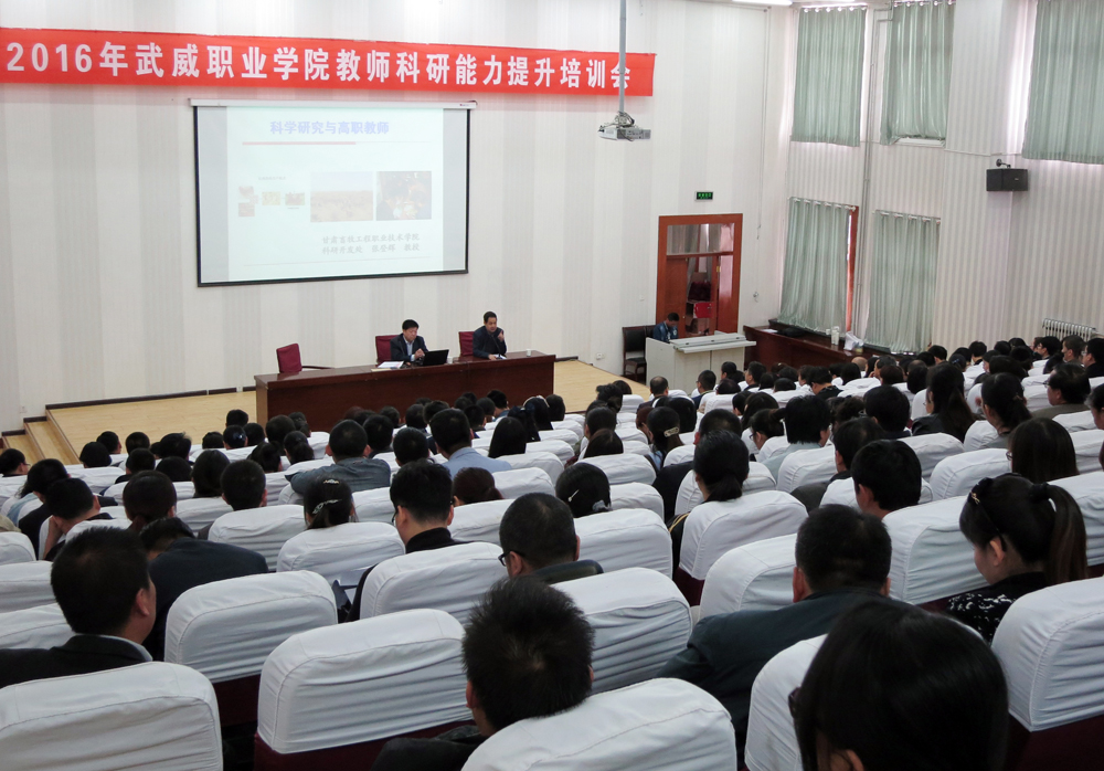 為進(jìn)一步推進(jìn)我院科研工作,營(yíng)造科研氛圍,提高教師科研能力,滿足教師對(duì)科研工作的需求,4月20日下午,學(xué)院科研處特邀甘肅畜牧工程職業(yè)技術(shù)學(xué)院教授、科研開(kāi)發(fā)處處長(zhǎng)張登輝在正德廳作了題為“科學(xué)研究與高職教師”為主題的培訓(xùn)講座。學(xué)院副院長(zhǎng)翟存祥主持會(huì)議,全院260多名教師參加了此次培訓(xùn)。