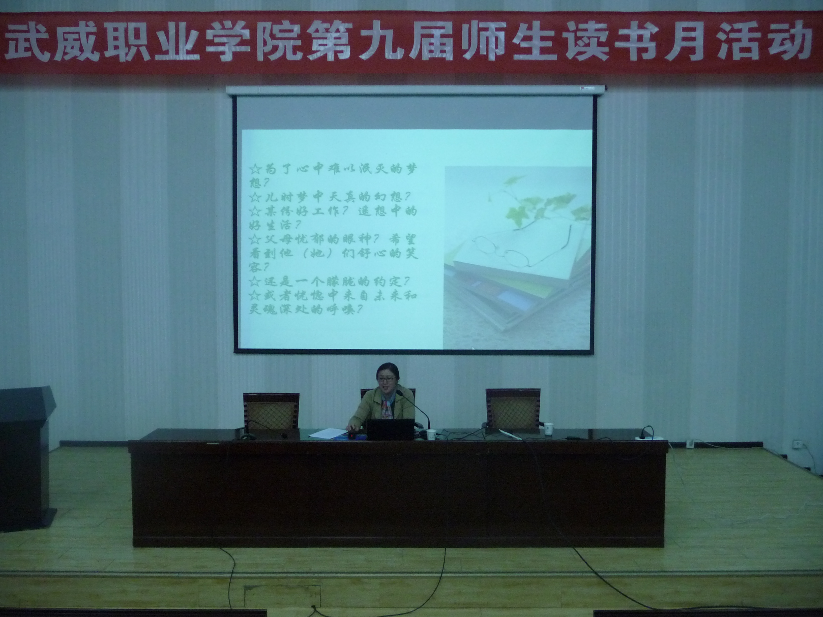 為在全院師生中營(yíng)造良好的讀書氛圍,豐富校園文化生活,在第22個(gè)世界讀書日來(lái)臨之際,4月20日,武威職業(yè)學(xué)院第九屆讀書月活動(dòng)專題講座在正德廳舉行。學(xué)院中文專業(yè)副教授、電子信息工程系主任李亞梅應(yīng)邀進(jìn)行了《為何而讀書》的專題講座,近300名師生參加了此次講座。