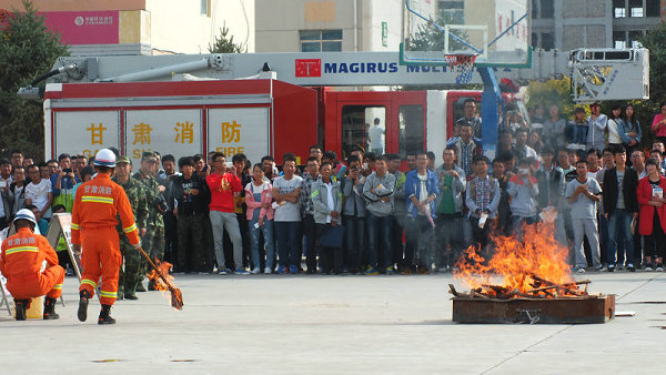 在演練現(xiàn)場,武威消防支隊的工作人員詳細講解了我院配備的ABC型干粉滅火器的性能、用途、操作方法及撲救初起火災(zāi)的注意事項,并進行了現(xiàn)場演示。2015級各新生代表組成滅火隊依照次序和規(guī)定,進行了模擬火災(zāi)的現(xiàn)場撲救演練。演練中,滅火隊員動作正確、快捷、滅火過程快速安全,觀摩的同學(xué)們也很認(rèn)真。